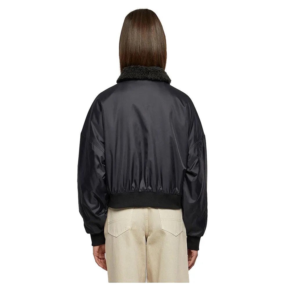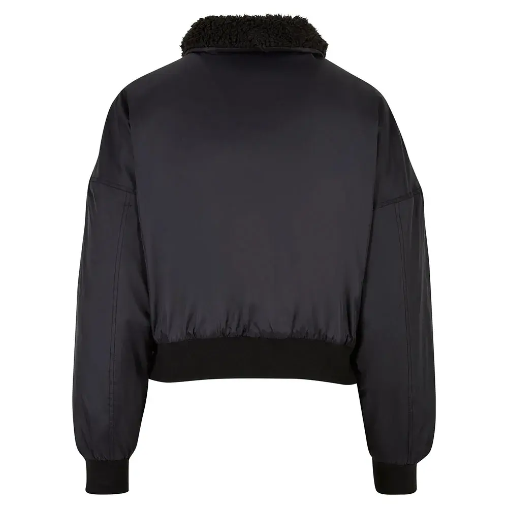 Однотонная женская куртка-бомбер отличается прочностью и стильным классическим кроем, дополненным пушистым воротником из шерпы. Она имеет традиционный короткий крой с широкими манжетами на рукавах и подоле и потайной молнией спереди. Два боковых кармана, которые также оснащены молниями, также практичны. Свободный крой с широкими спущенными плечами придает женскому бомберу повседневный вид. Куртка изготовлена из нейлоновой саржи и подбита тафтой.