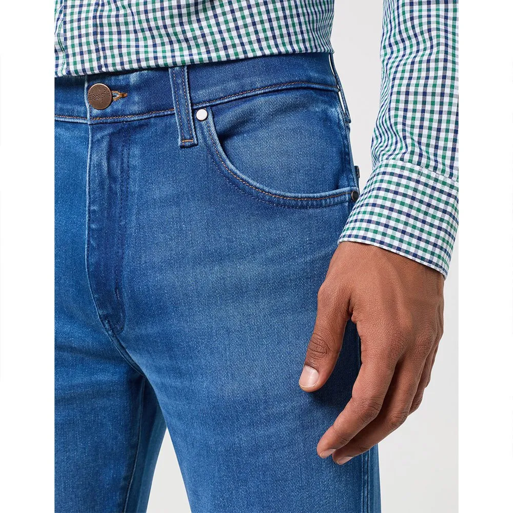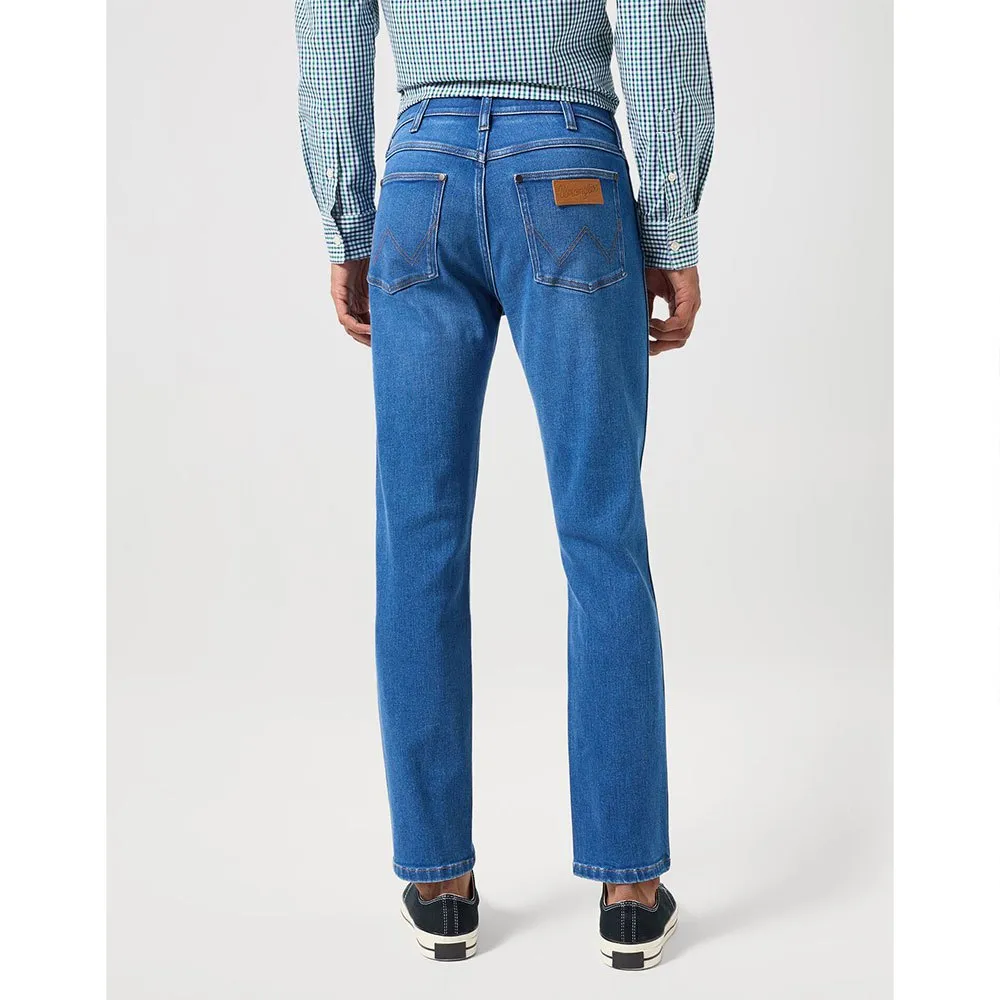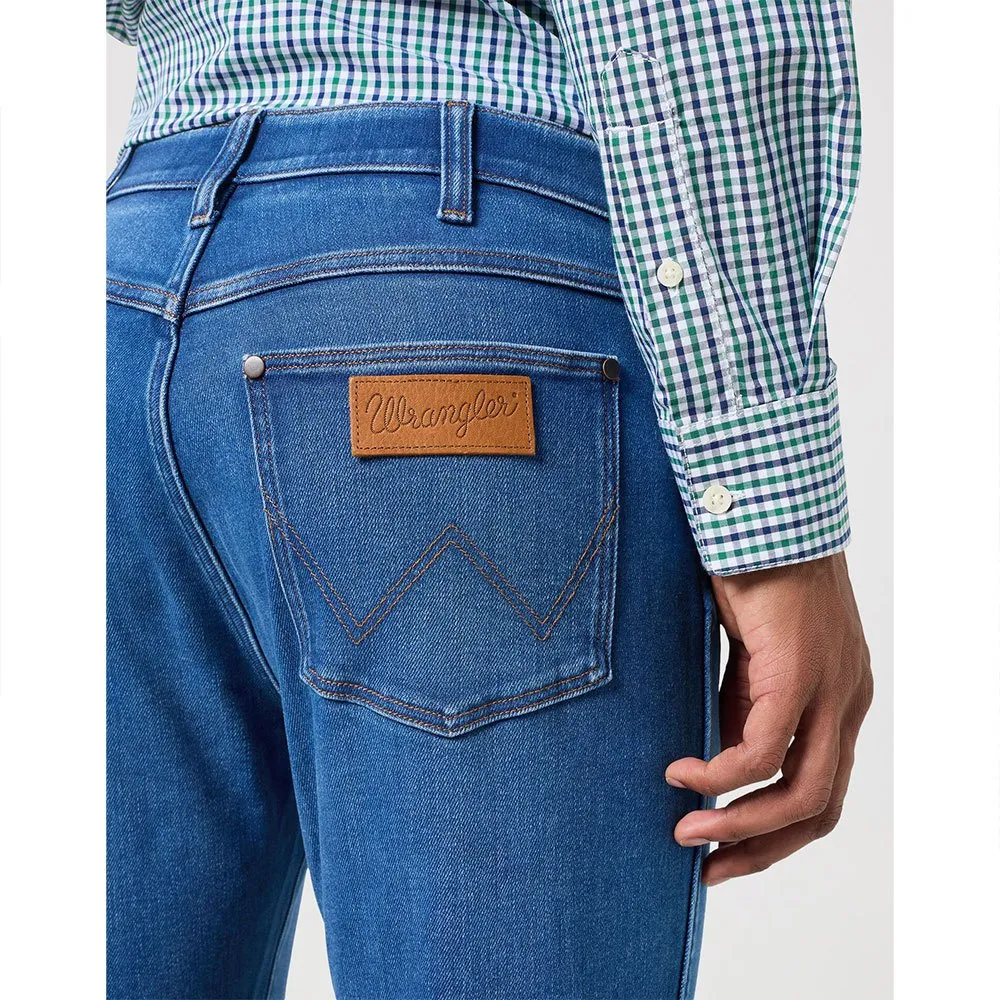 Классические детали включают застежку-молнию на пуговицах, пять карманов, контрастную строчку и культовый Wrangler.