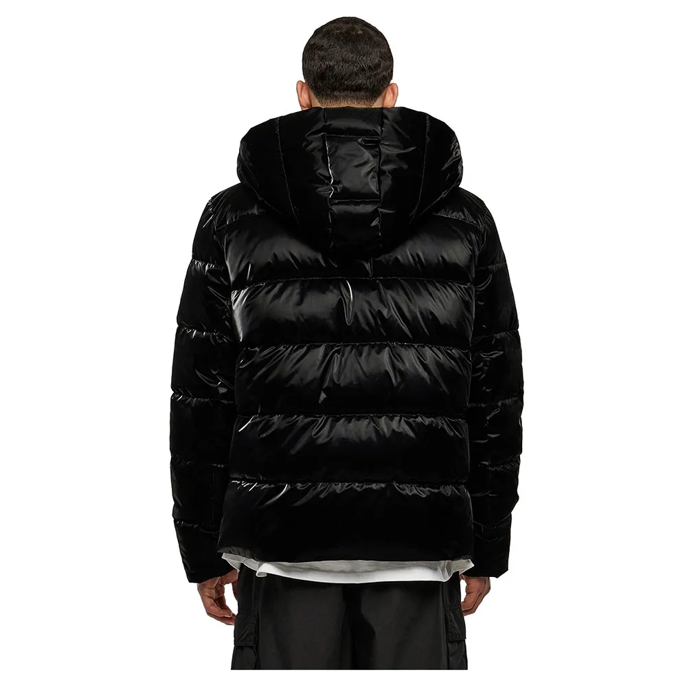 Мужская стеганая куртка стильного дизайна с толстой подкладкой, широкой крестообразной строчкой и мерцающим, особо прочным материалом, имитирующим кожу акулы, выполненным из полиуретана. Она имеет роскошную подкладку из тафты, боковые карманы на молнии и внутренний карман. Капюшон и подол куртки регулируются с помощью эластичной кулиски и фиксатора. Мужская стеганая куртка застегивается на молнию спереди. Ребристые манжеты гармонично дополняют образ. Утепленная мужская куртка имеет удобный классический крой.