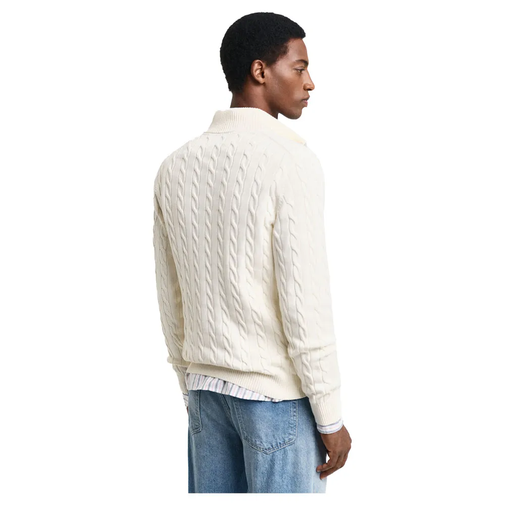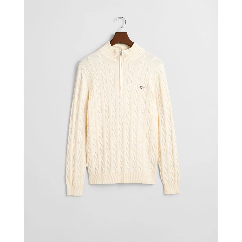 Изготовленный из 100% хлопка, он имеет классический крой со спортивным воротником-молнией до половины длины, ребристые детали на подоле и манжетах, а также вышитый на груди рисунок щита GANT.