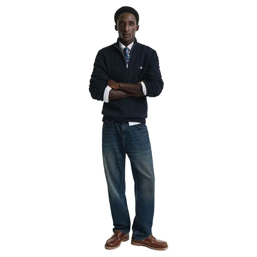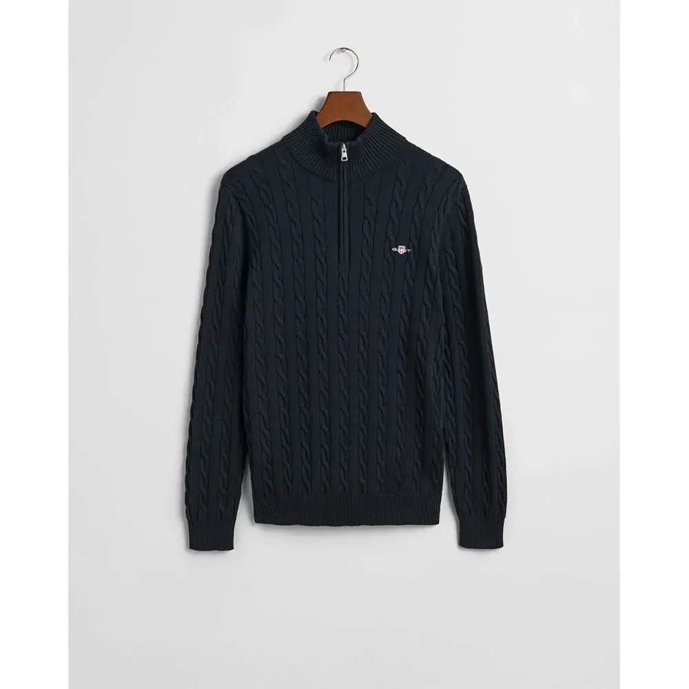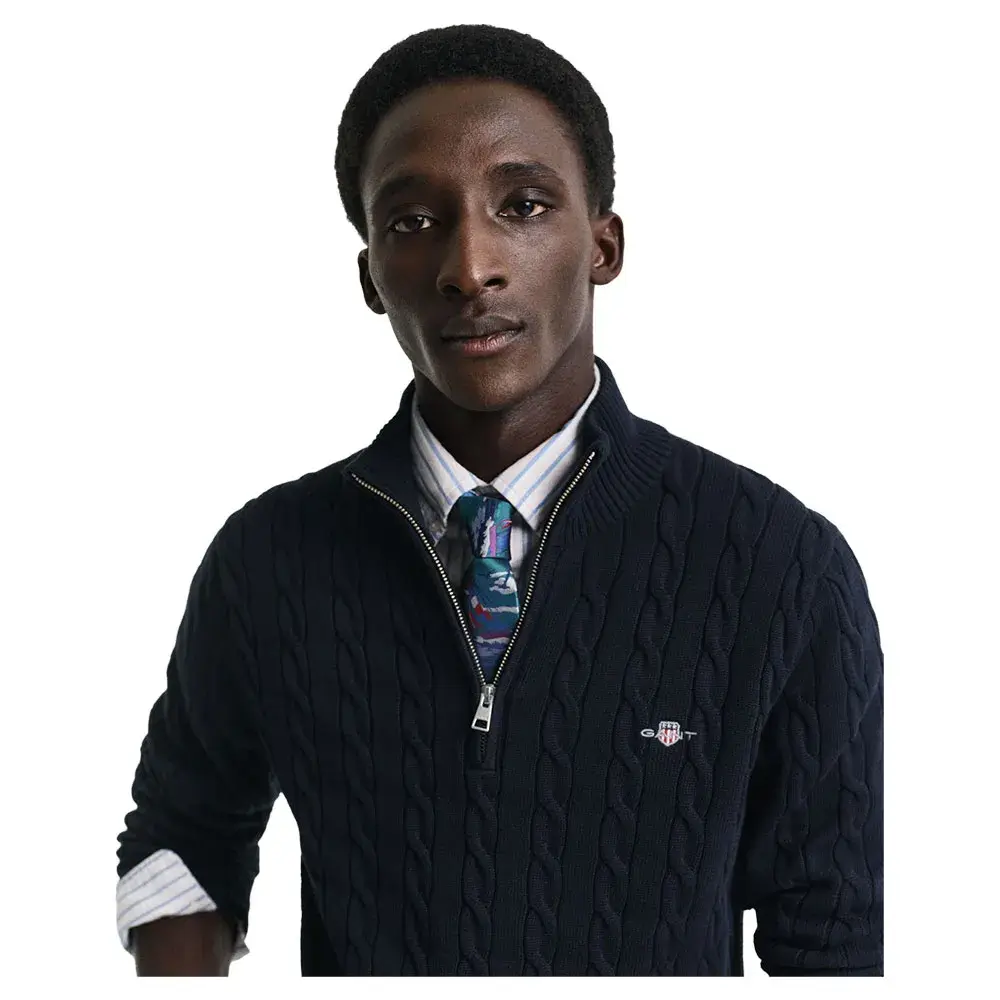 Изготовленный из 100% хлопка, он имеет классический крой со спортивным воротником-молнией до половины длины, ребристые детали на подоле и манжетах, а также вышитый на груди рисунок щита GANT.