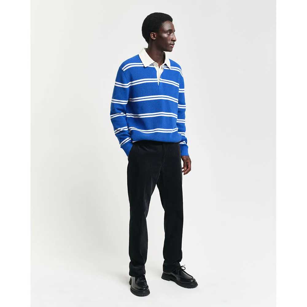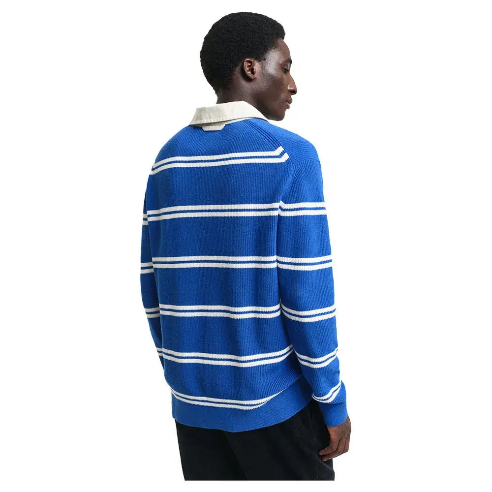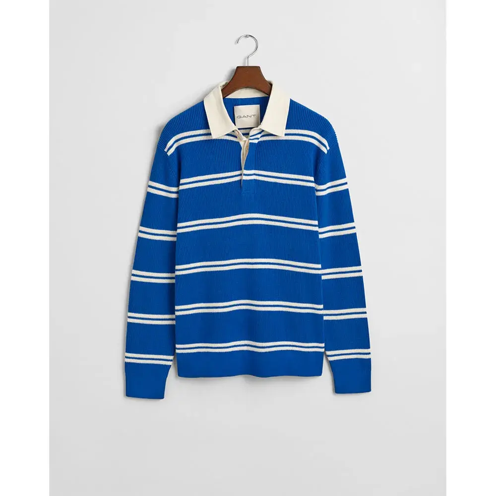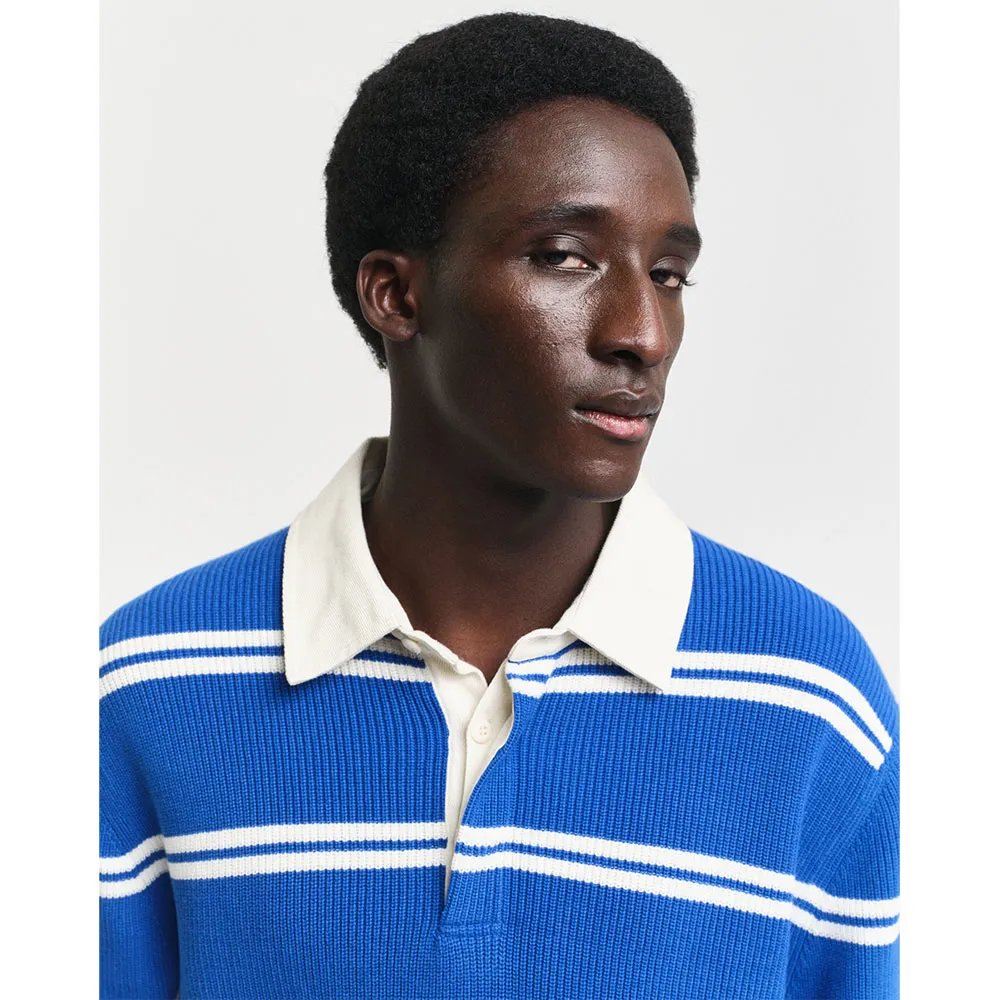 Представляем трикотажную версию нашего любимого силуэта регби, эта хлопковая регбийная куртка имеет ребристую структуру вязки, украшенную повторяющимся полосатым рисунком.