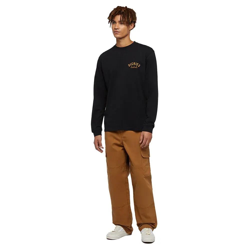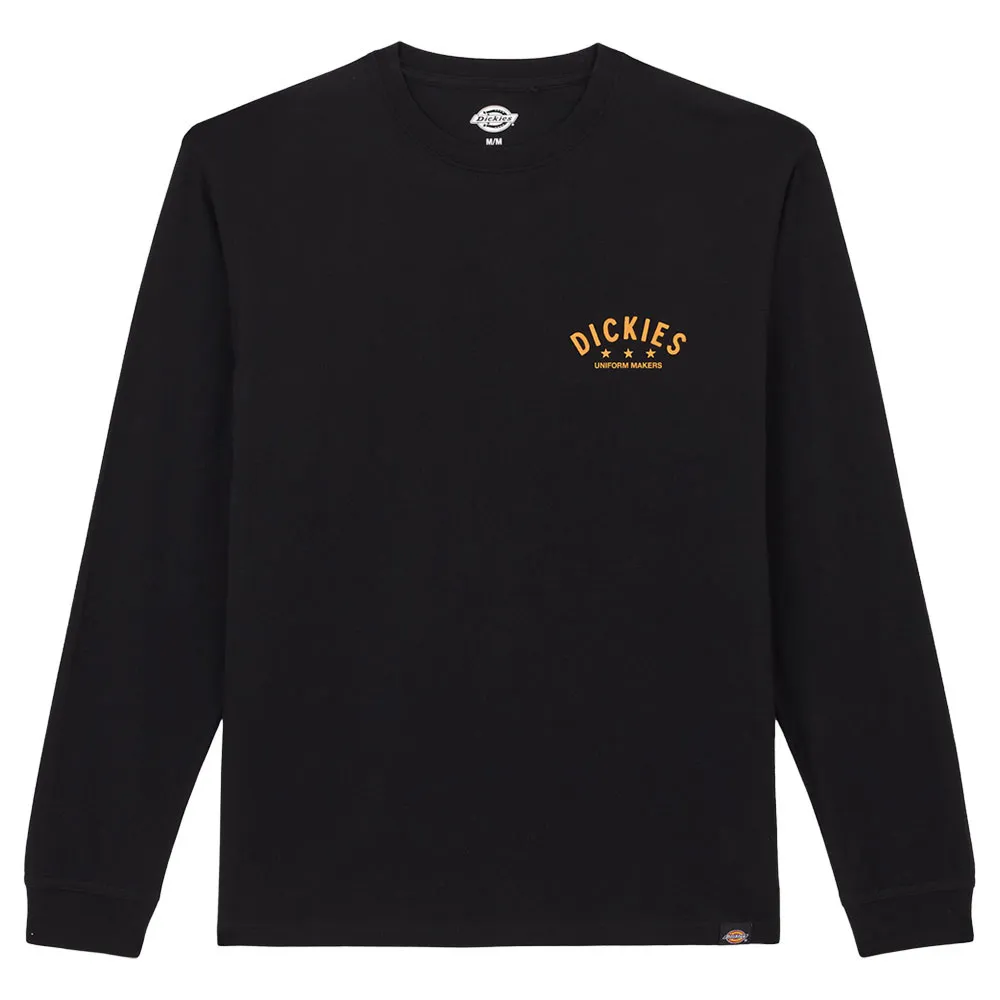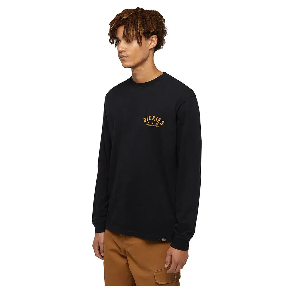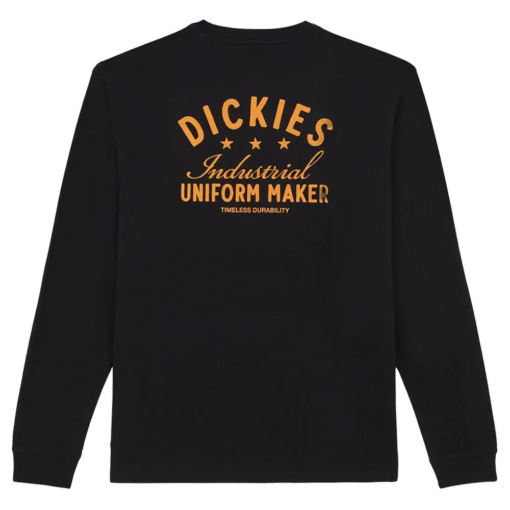 Основной предмет гардероба с ребристым круглым вырезом и манжетами, большой и смелой классической текстовой графикой «Dickies Industrial Uniform Supply» на спине и упрощенной текстовой графикой Dickies на левой стороне груди.