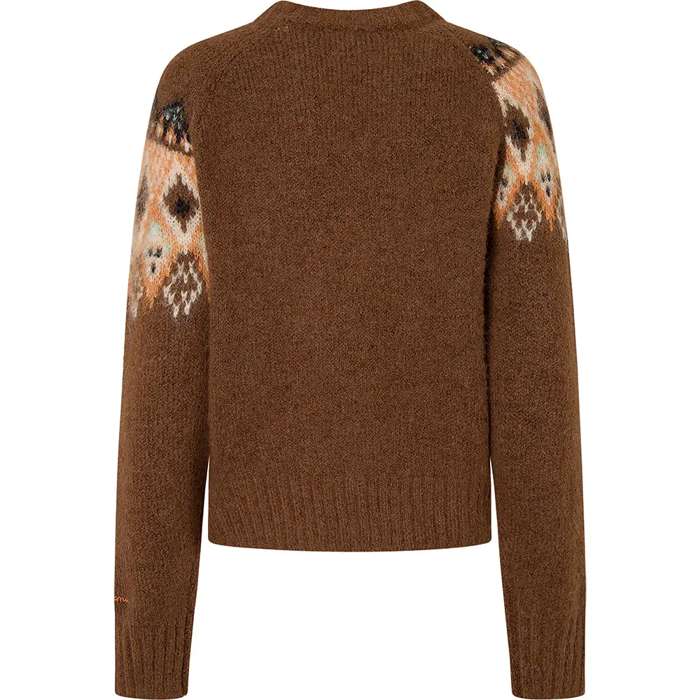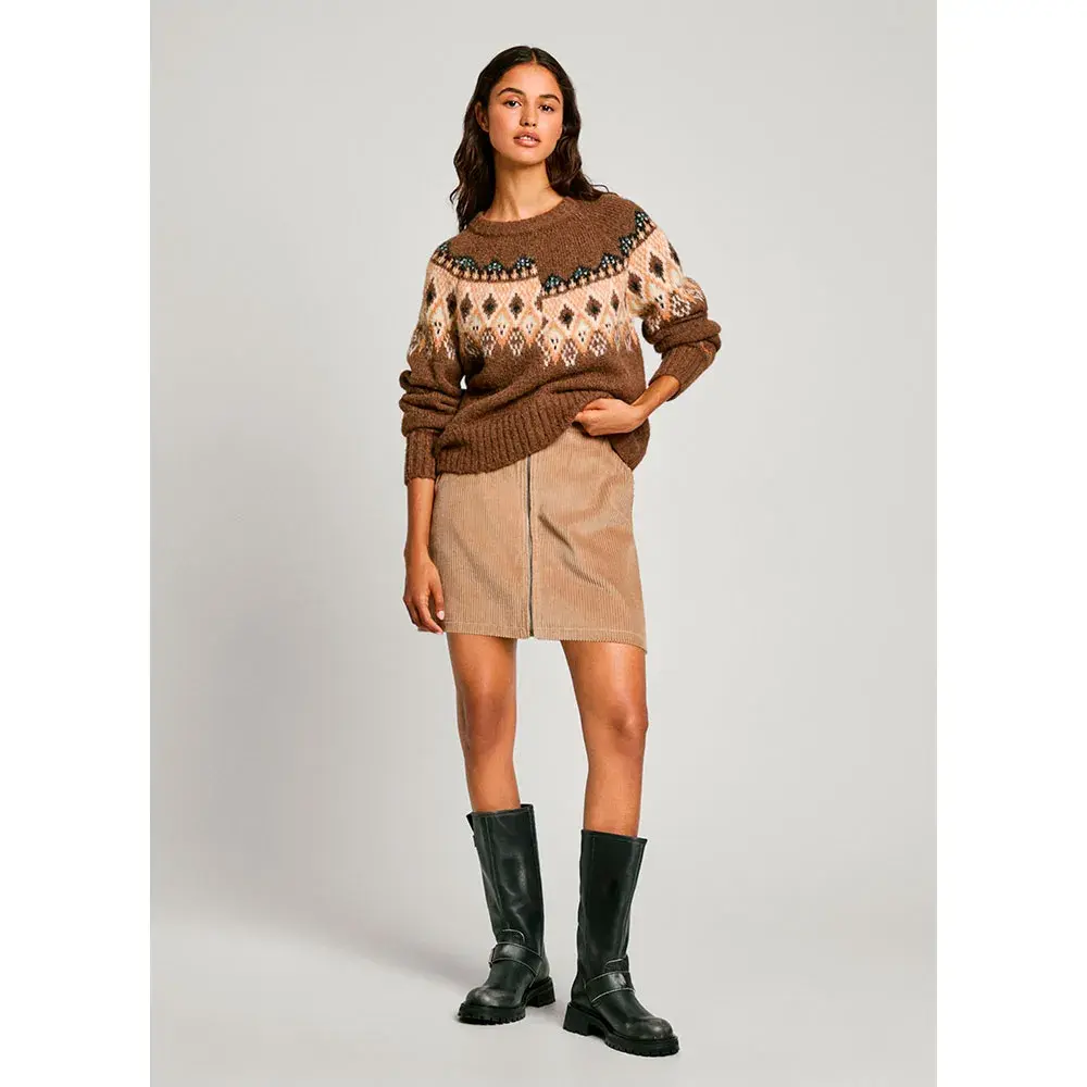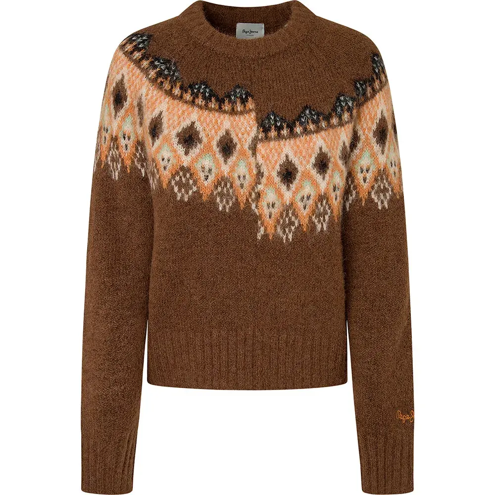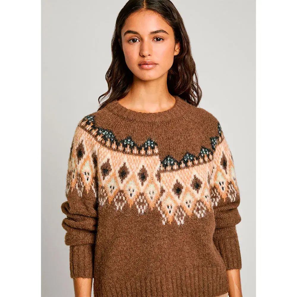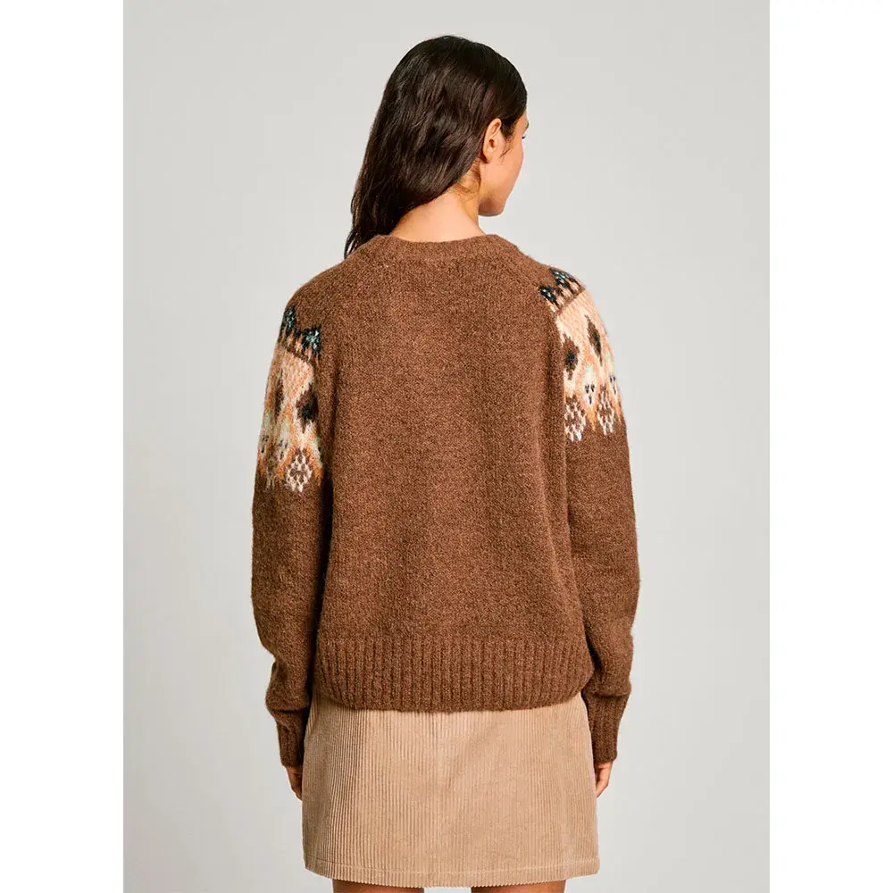 Круглый вырез горловины с позиционным жаккардом по переду и спинке, с косым швом спереди со смещенным жаккардом.