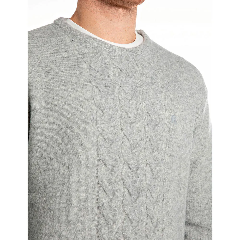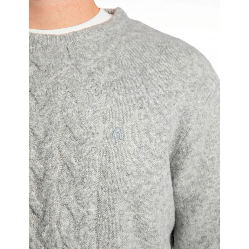 Пуловер прямого кроя с круглым вырезом из комфортного однотонного переработанного полиэстера – более экологичного материала. Эта модель с длинными рукавами и слегка спущенной линией плеч выделяется благодаря косичному вязанию по центру и тонкой резинке на горловине, манжетах и подоле. Вышитая на груди культовая буква R в тон добавляет завершающий штрих к дизайну.