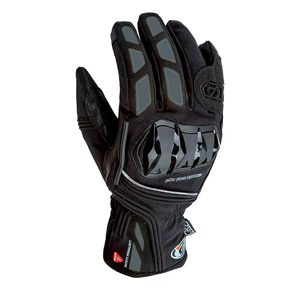 Мягкие протекторы из ЭВА на пальцах. Цифровая нашивка из микрофибры и TPR-протектор на ладони. Нескользящий силикон на пальцах и ладони для дополнительного сцепления. Стеклоочиститель козырька для вытирания дождя. Ремешок на запястье, чтобы перчатки не соскользнули при падении, и застежка на липучке для плотного прилегания к рукаву куртки. Нашивки из токопроводящего материала, вшитые в большой и указательный пальцы, позволяют владельцу пользоваться устройствами с сенсорным экраном. Перемычка для 3-4-го пальца предотвращает перекручивание пальцев и потенциальный разрыв шва в случае удара. Светоотражающий. CE 13594: омологация 2015. Цвета: черный / темно-серый, черный / светло-серый, черный / красный и черный / флуоресцентный. Размеры: от XS до XXL. Верхняя часть наколенника выполнена в черном цвете и может быть приобретена отдельно в цветах fluor, red и titanium grey.