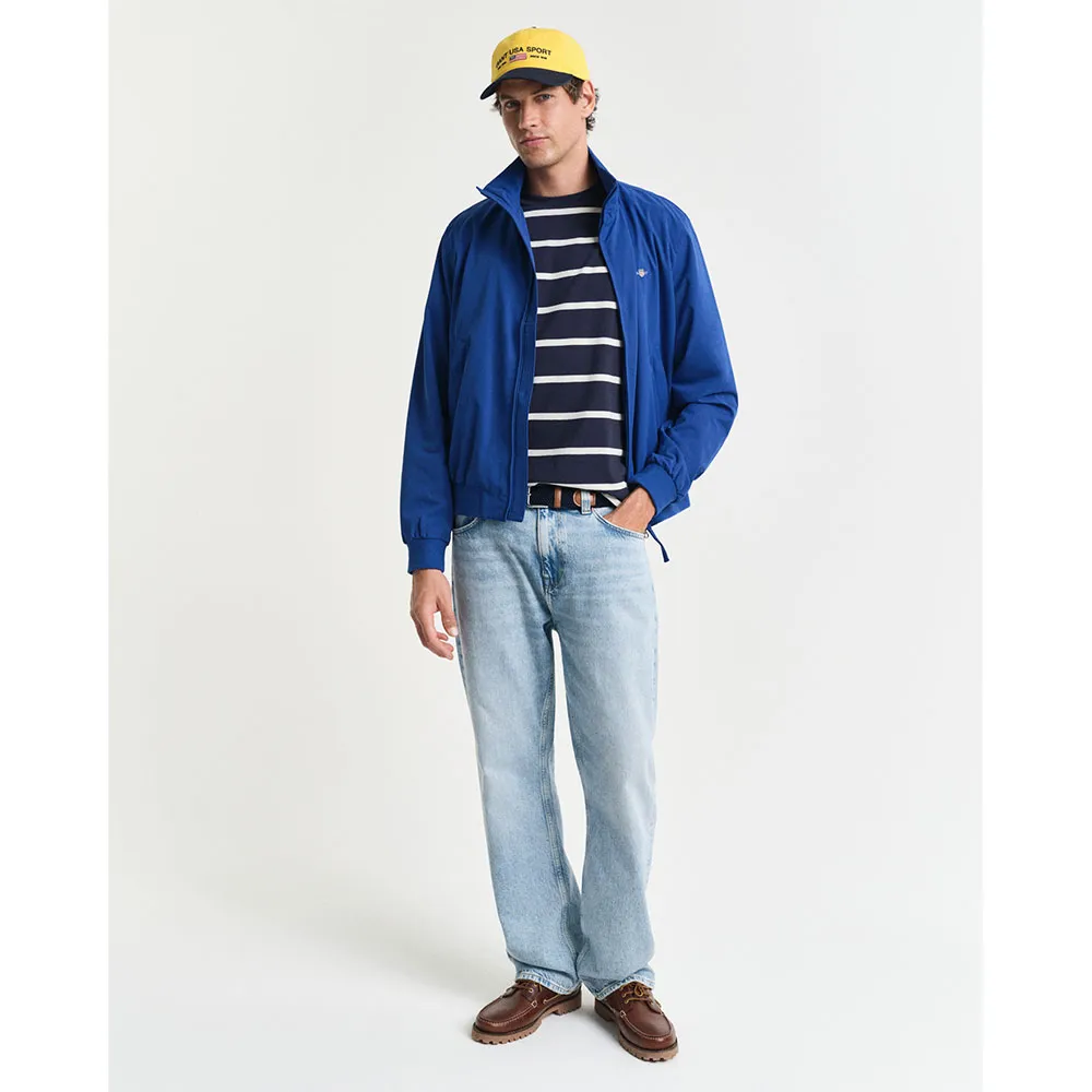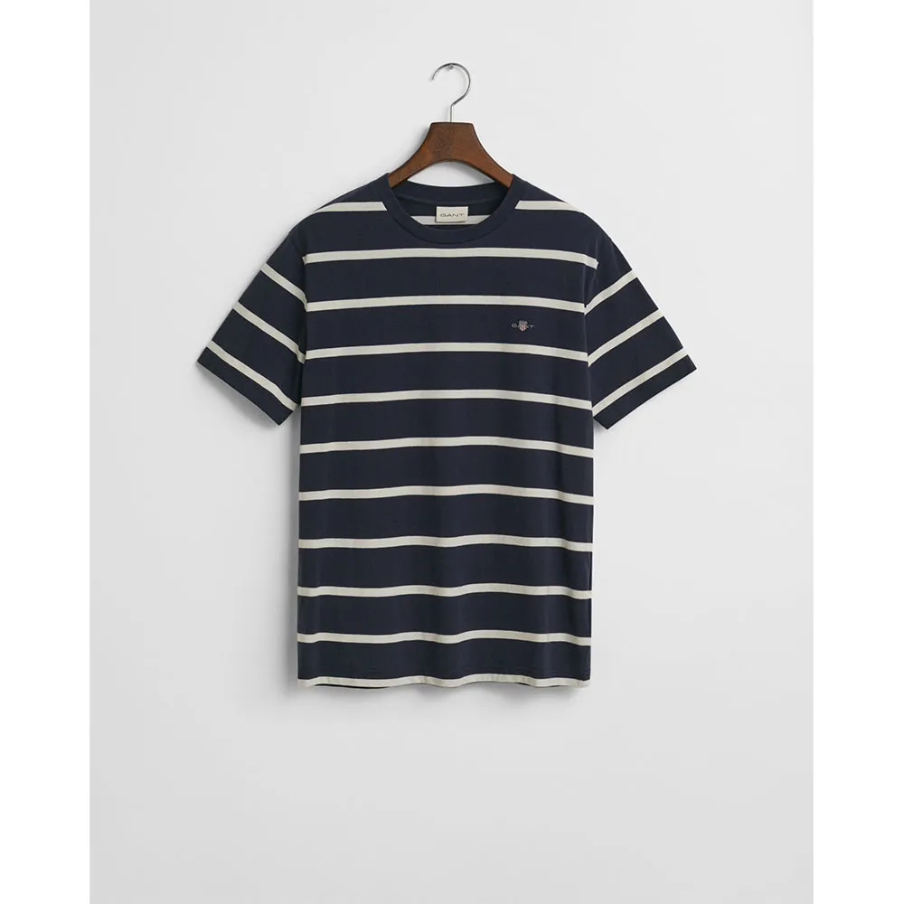 Изделие имеет стандартный крой, короткие рукава, ребристый круглый вырез горловины и вышитый щит GANT на груди.