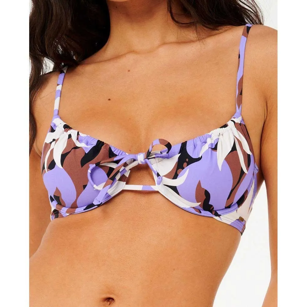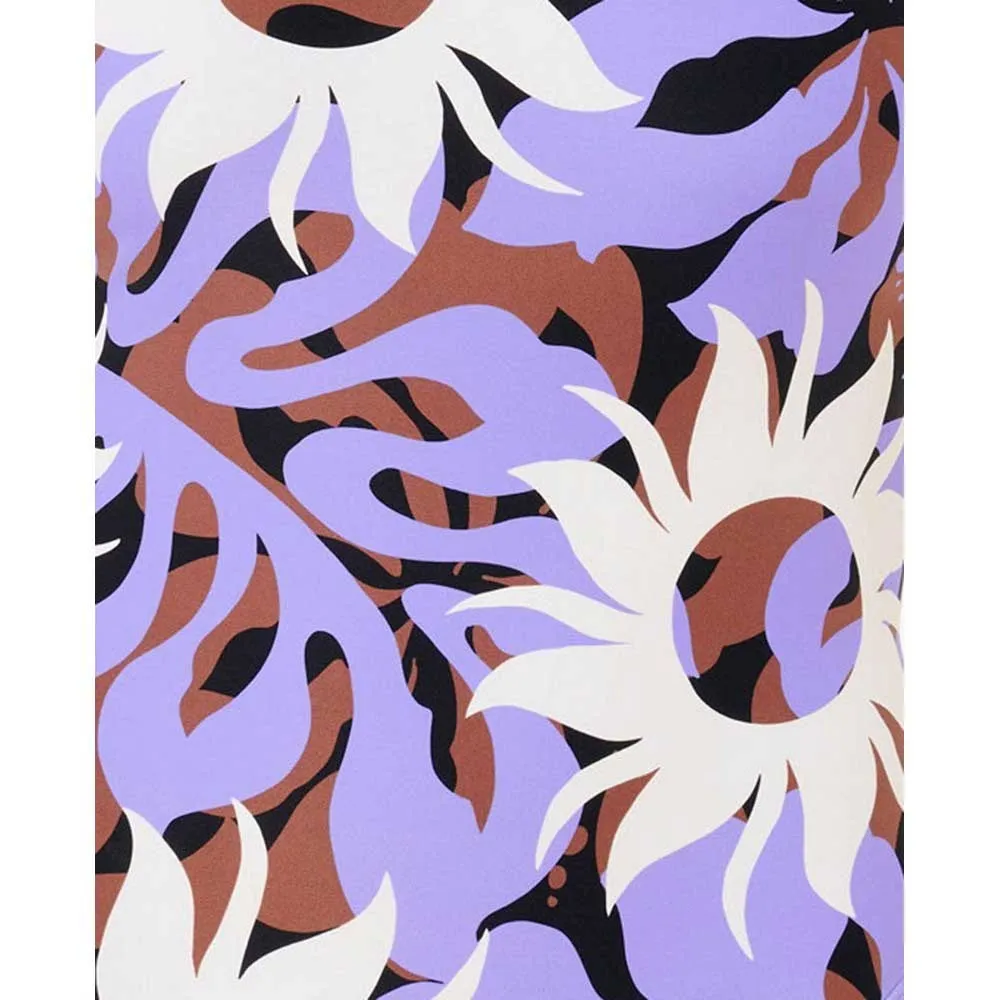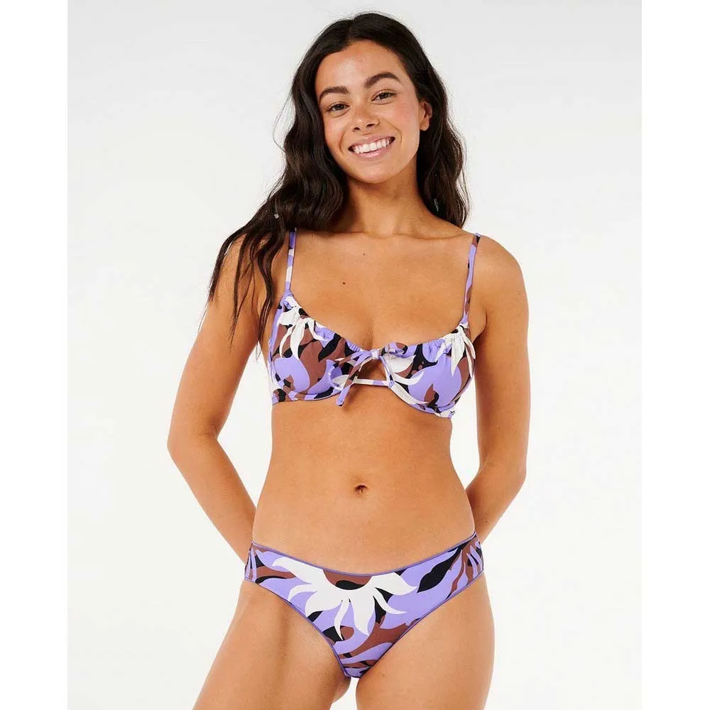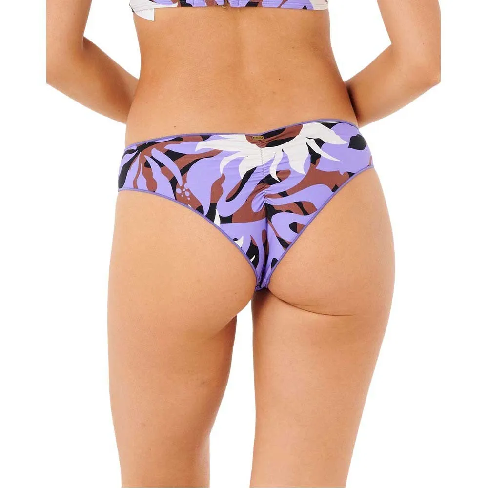 Эти плавки-бикини в фиолетовых тонах с привлекательным кроем, ярким цветочным рисунком и сборкой на спине идеально подойдут для элегантного пляжного образа.