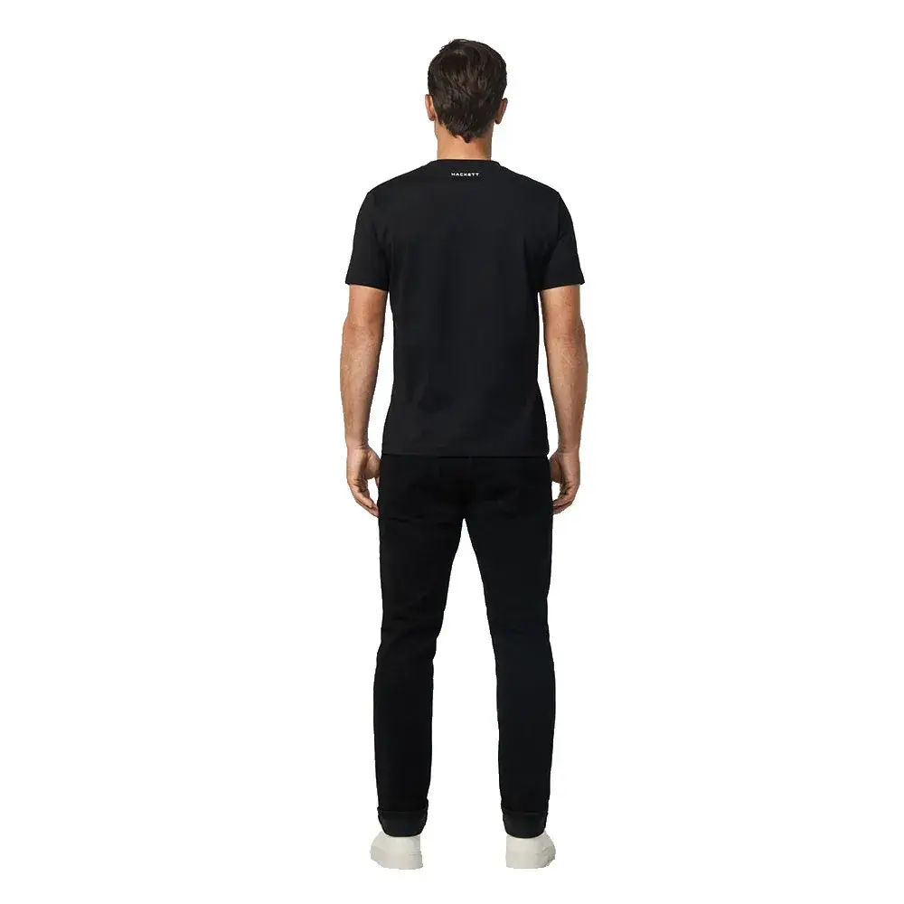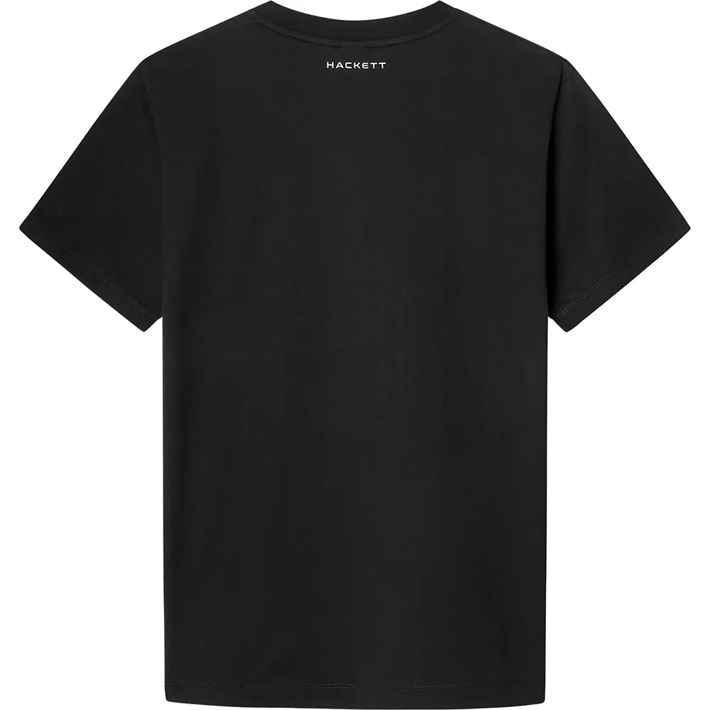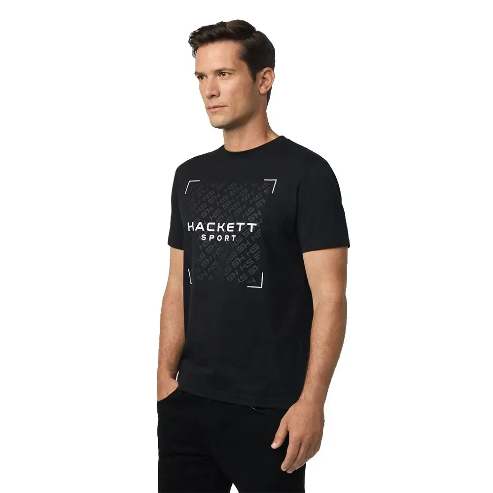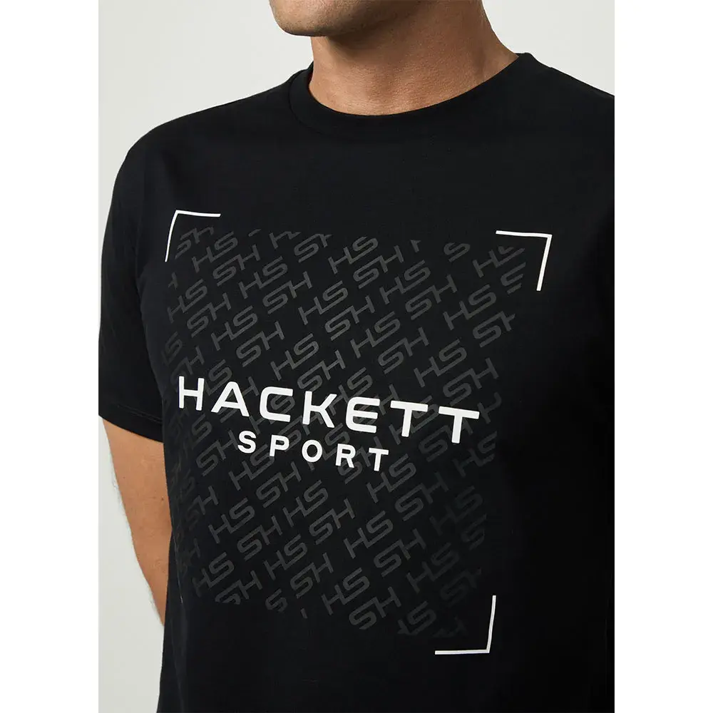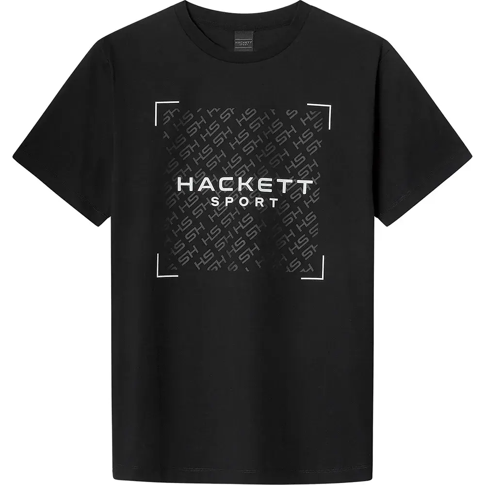 Футболка из 100% хлопка с контрастным логотипом HSPORT по центру груди, поверх которого расположен повторяющийся видимый логотип HS в тон с контрастными цветными краями.