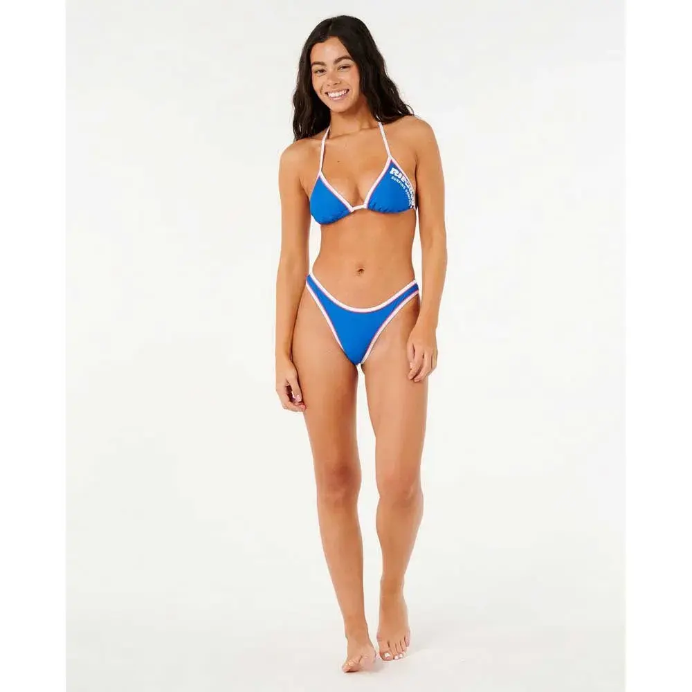 Эти ультракороткие плавки бикини выполнены в смелом синем дизайне с контрастной белой и красной отделкой и имеют привлекательный высокий вырез, идеально подходящий для элегантного и спортивного пляжного образа.