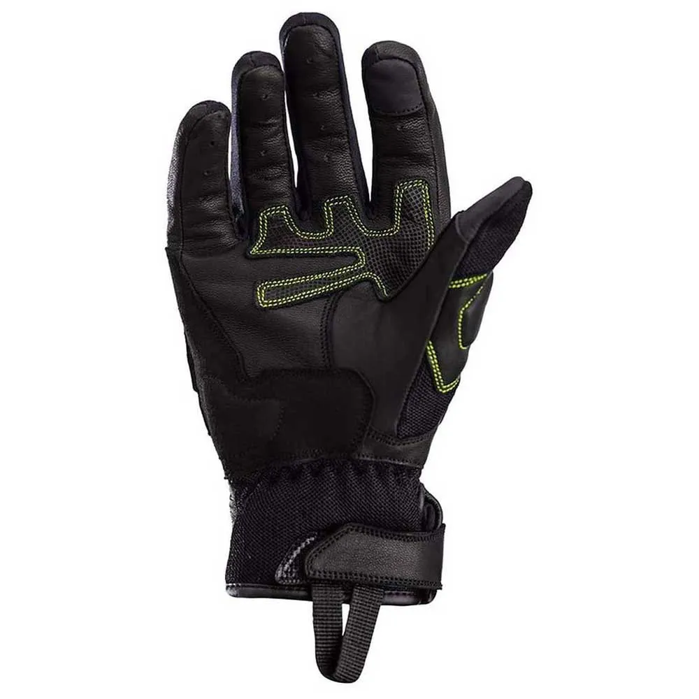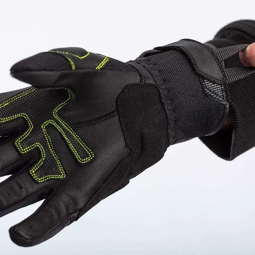 Этому способствуют кожаная накладка Smart touch на указательном пальце, предварительно изогнутые пальцы и застежка на крючок и петлю - идеальный вариант для летней езды.