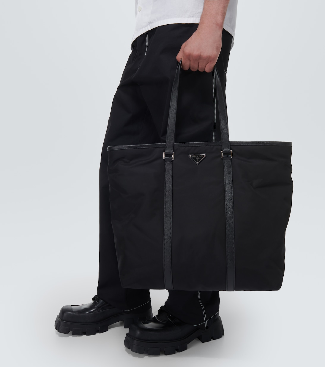 Кожаная сумка-тоут Prada сочетает в себе практичность и стиль. Застёжка-молния, кожаные ручки сверху для удобной переноски и треугольный логотип делают её универсальным и функциональным аксессуаром на каждый день.