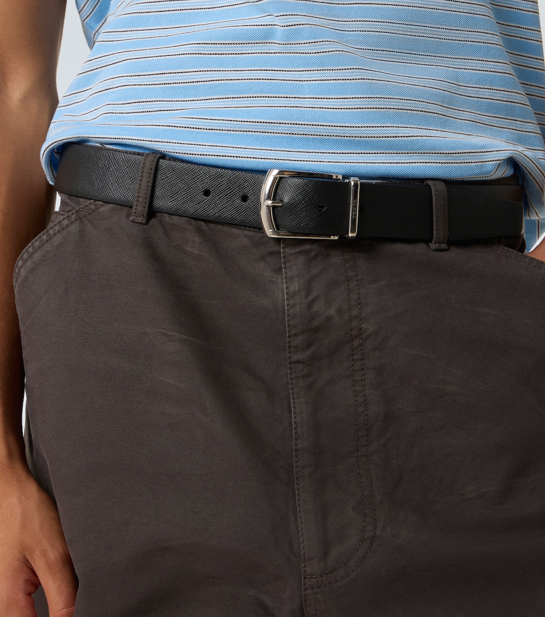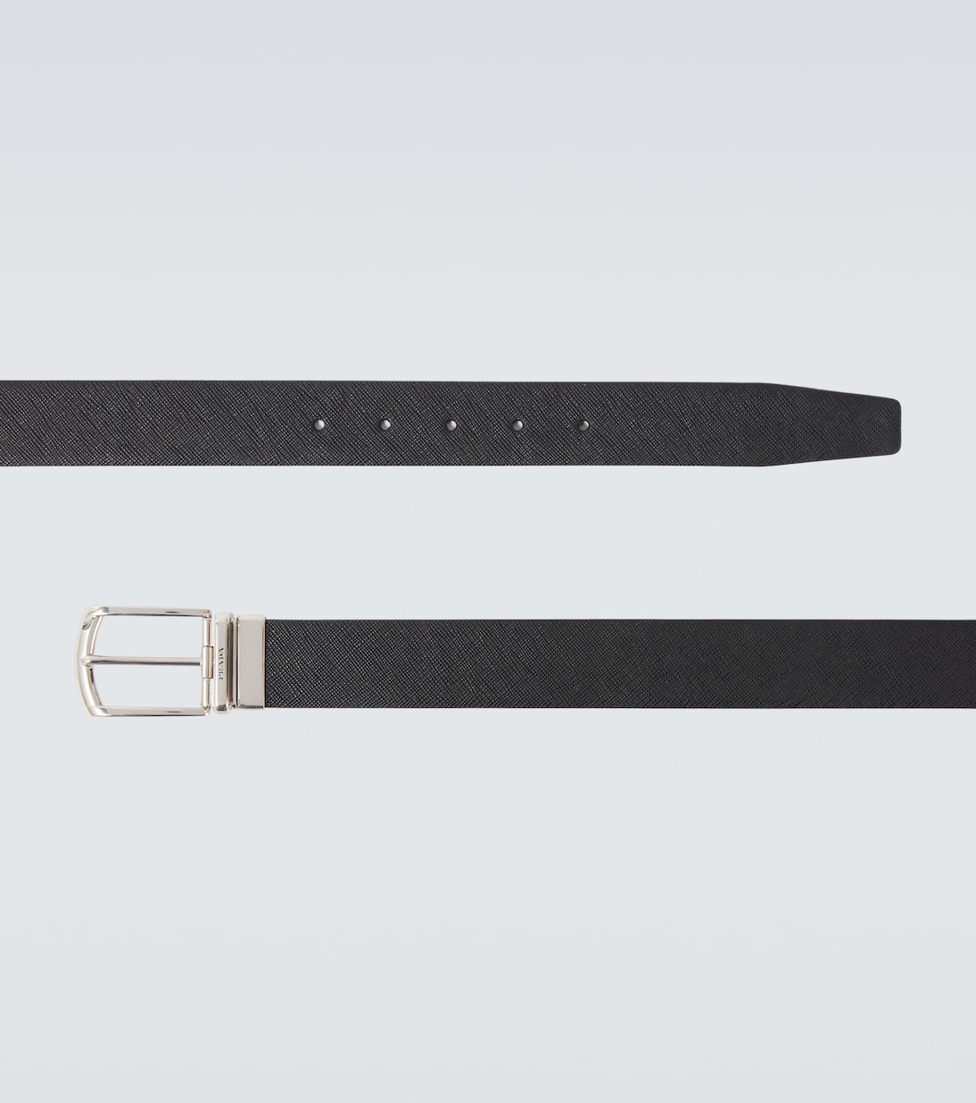 Кожаный ремень Prada изготовлен в Италии из натуральной кожи и дополнен элегантной пряжкой. Этот минималистичный дизайн отражает изысканный подход бренда к повседневным аксессуарам.