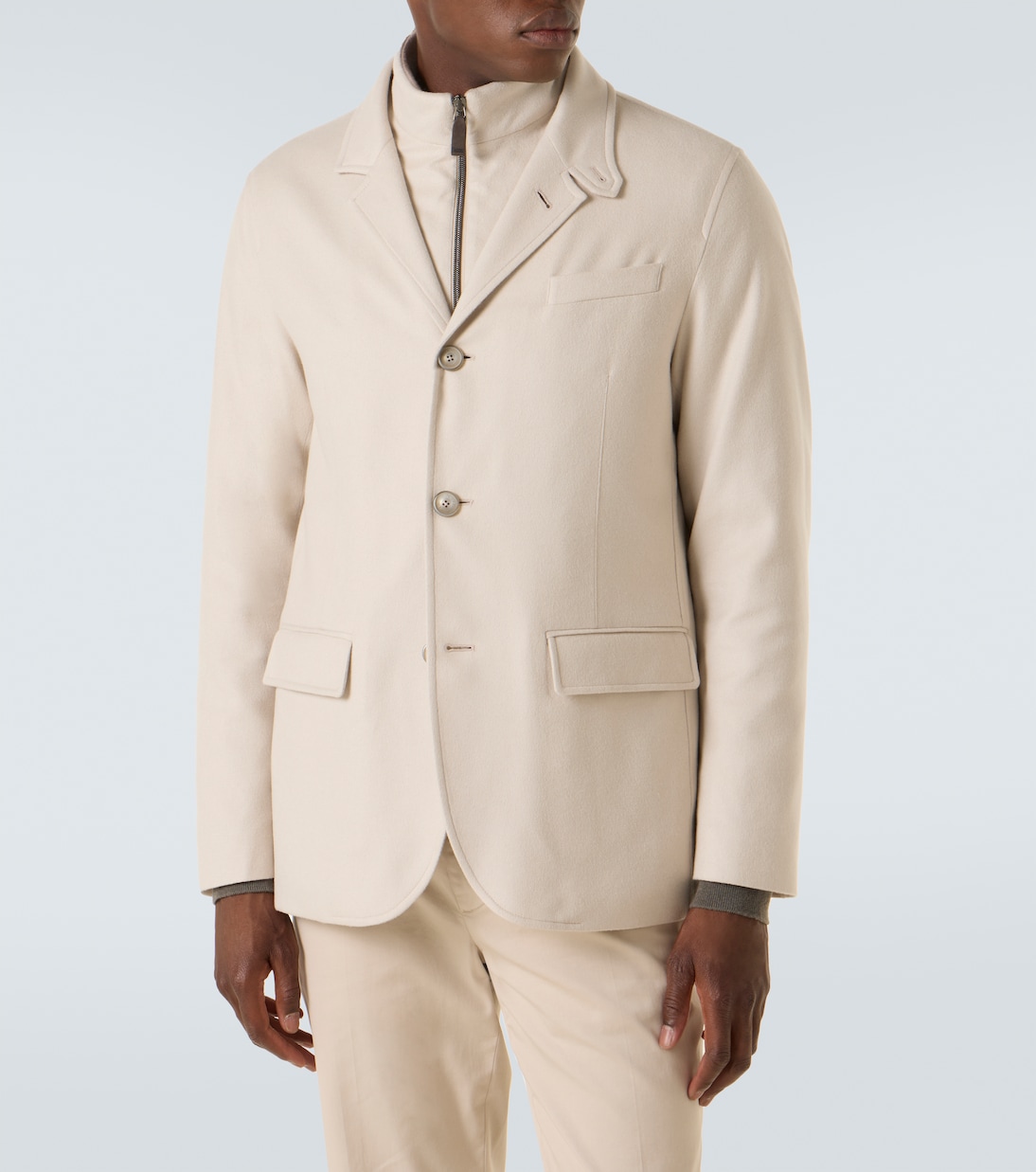 Компания Herno, специализирующаяся на производстве водонепроницаемой верхней одежды, была создана для борьбы с непредсказуемым климатом долины Эрно в Италии. Этот пиджак, изготовленный из шелка и кашемира, имеет многослойный дизайн со съемной нижней вставкой на молнии.