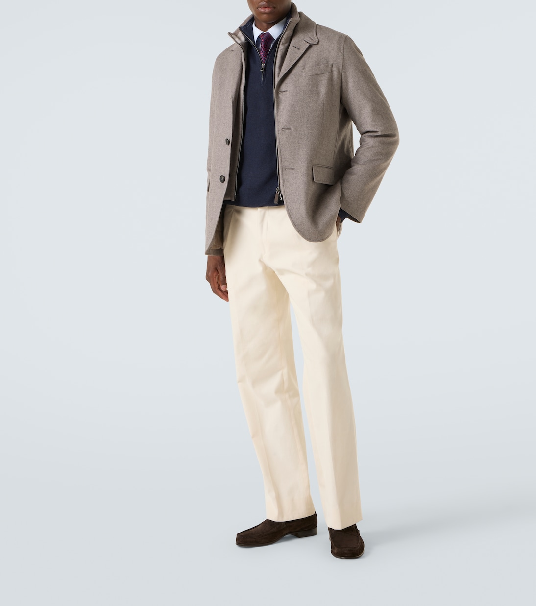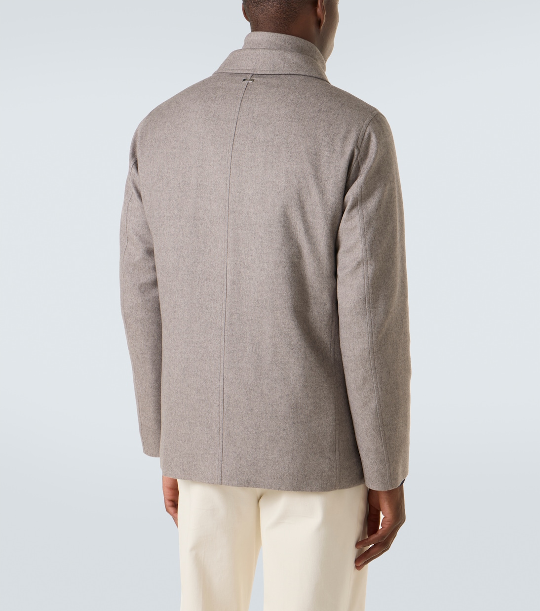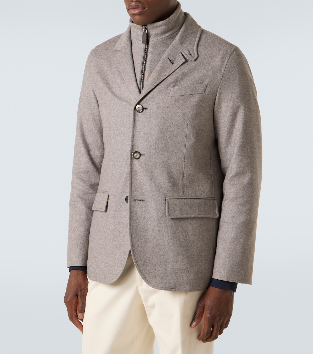 Компания Herno, специализирующаяся на производстве водонепроницаемой верхней одежды, была создана для борьбы с непредсказуемым климатом долины Эрно в Италии. Этот пиджак, изготовленный из шелка и кашемира, имеет многослойный дизайн со съемной нижней вставкой на молнии.