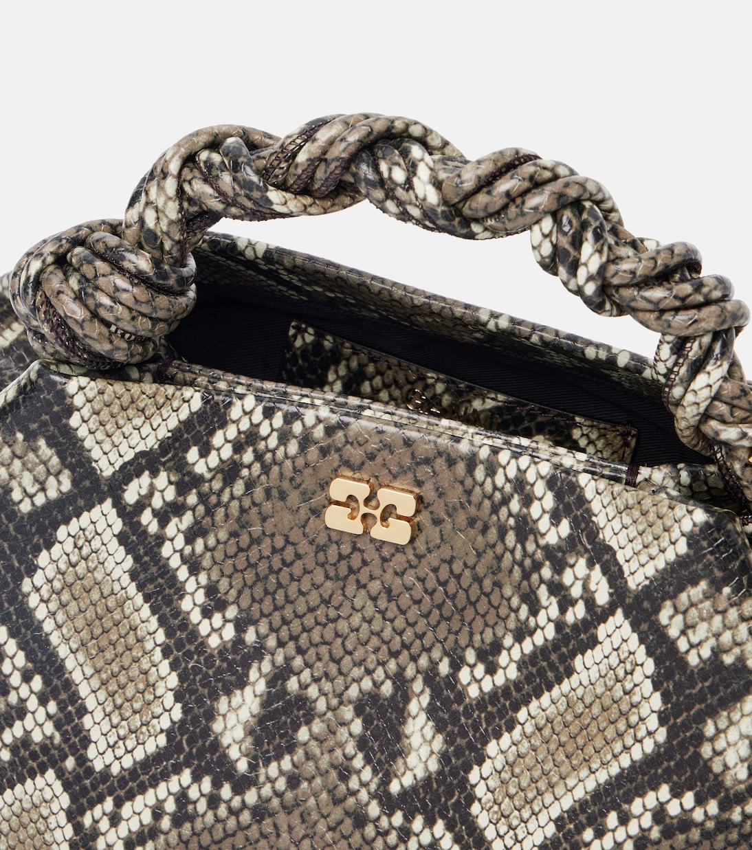 Копенгагенский бренд Ganni переосмысливает скандинавский стиль благодаря своему причудливому и игривому подходу к дизайну. Сумка-шоппер Bou имеет шестиугольный силуэт и украшена эффектным змеиным узором.