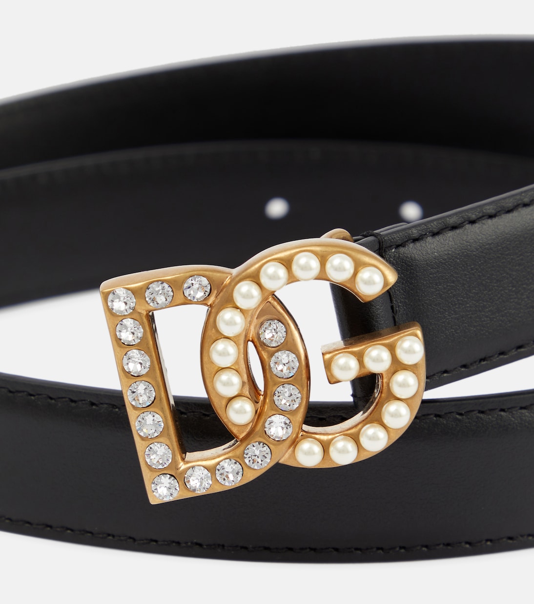 Украшенный кристаллами и искусственным жемчугом, логотип Dolce&Gabbana DG мгновенно добавляет гламура этому повседневному ремню. Ремень изготовлен из зернистой телячьей кожи с полосой средней ширины.