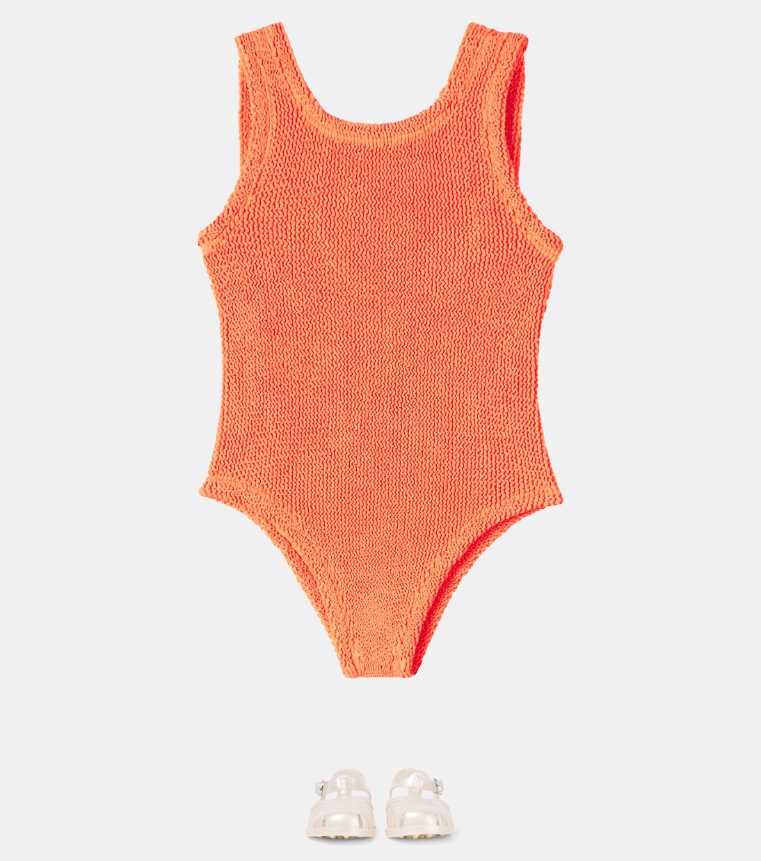 Фирменная жатая ткань Hunza G Kids обеспечивает максимальную вентиляцию и комфорт малышам в жаркие дни. Этот купальник ярко-оранжевого цвета подходит для детей от 2 до 6 лет.