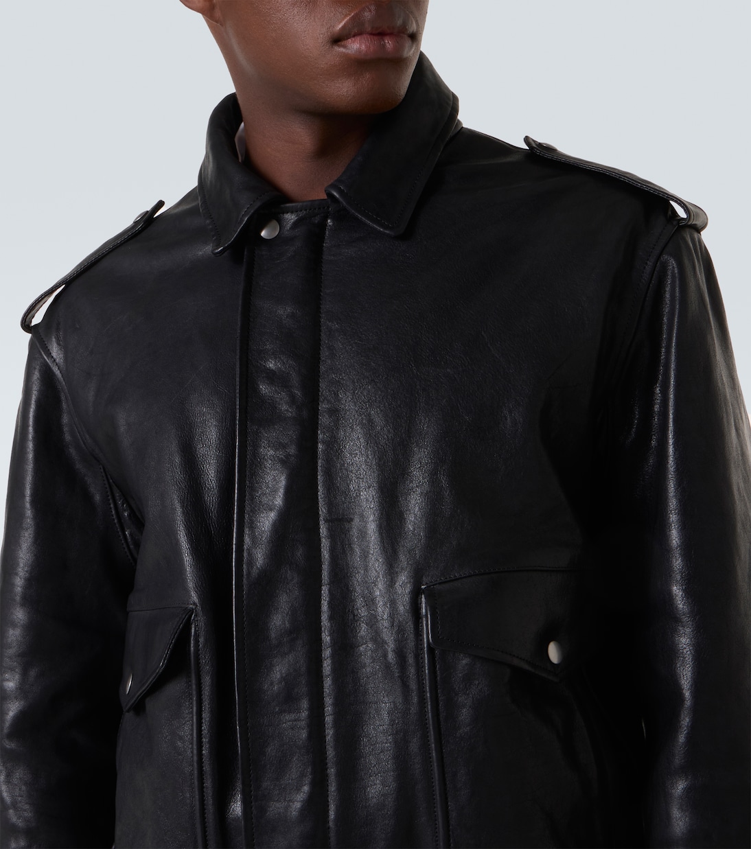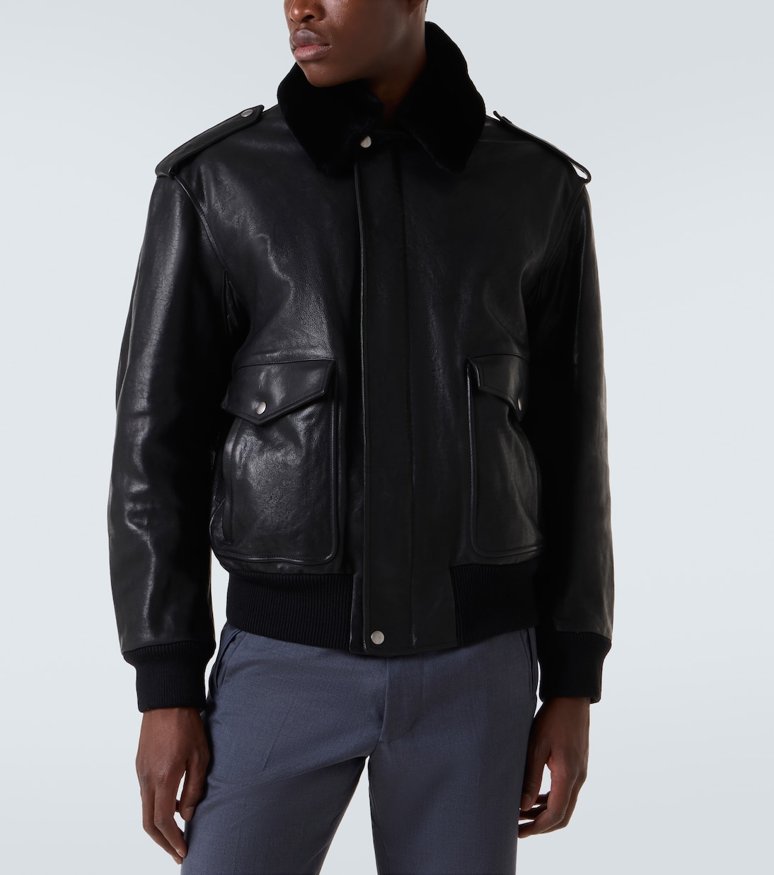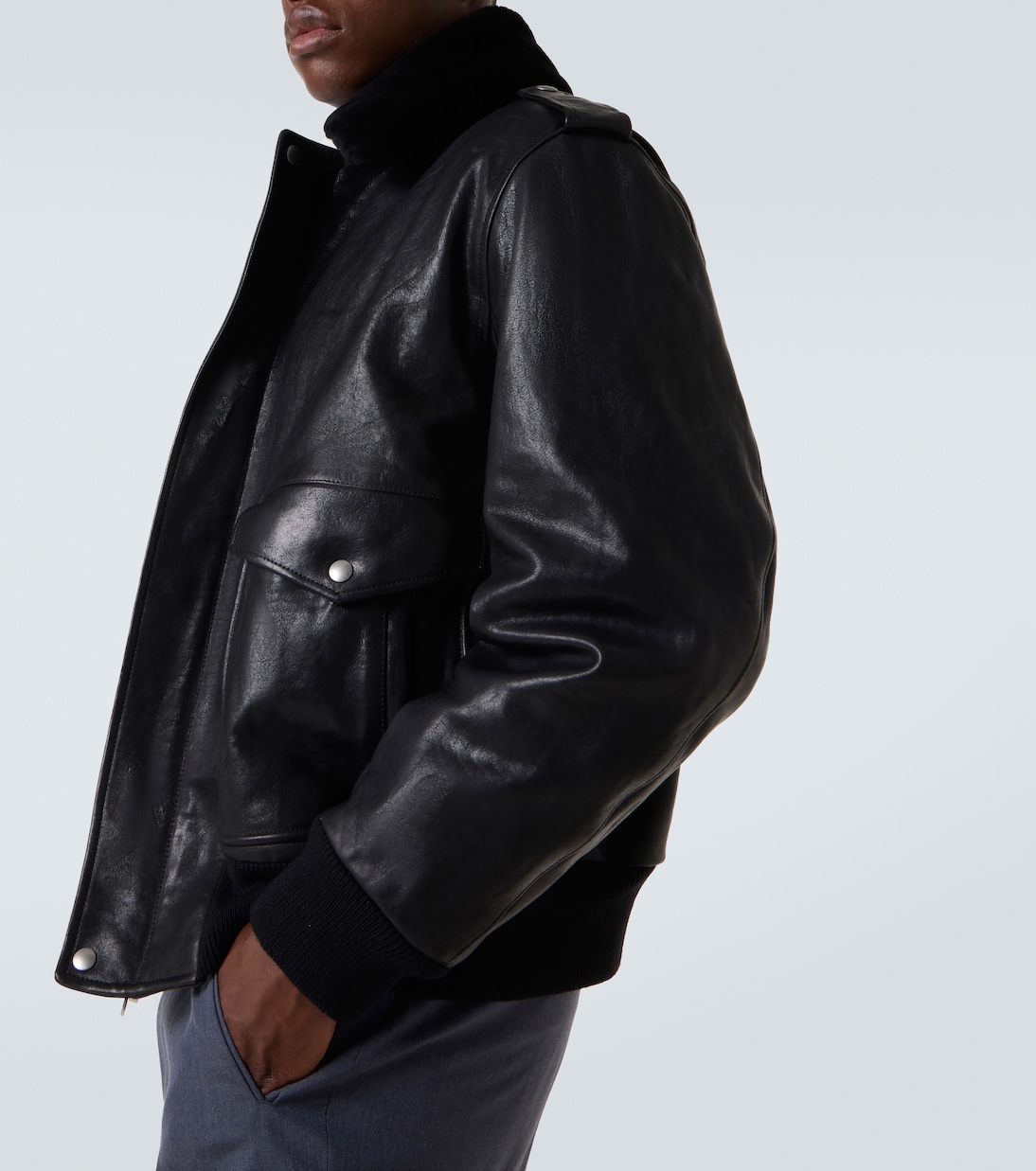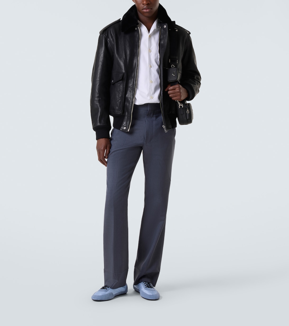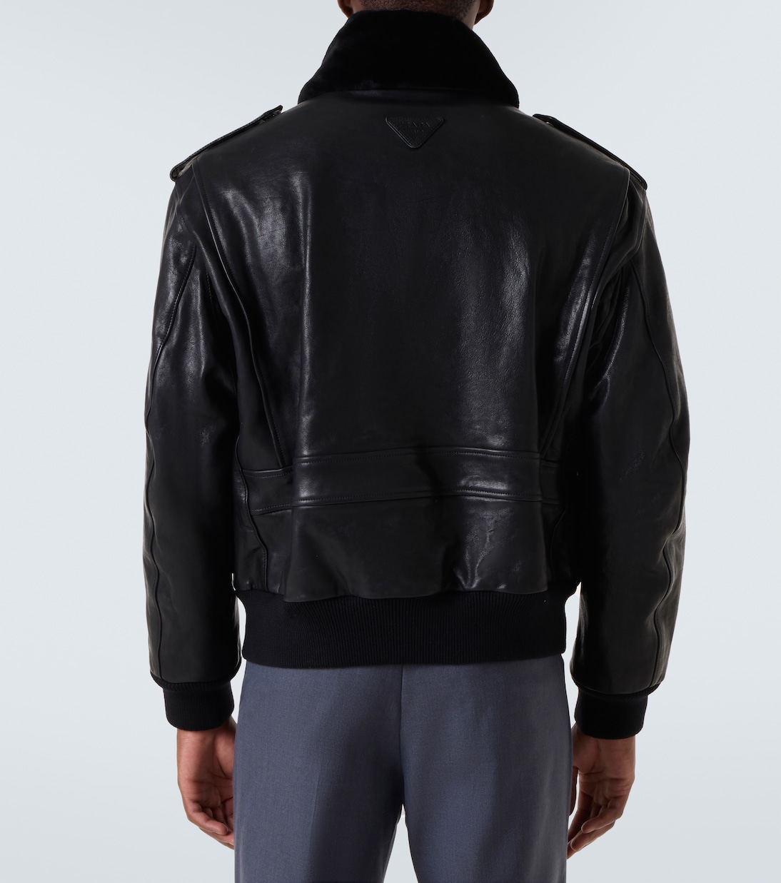 Фирменная телячья кожа Prada Spazzolato — это цельнозерновая кожа, отполированная до блеска. Эта утепленная куртка с силуэтом, вдохновленным авиаторами, имеет воротник из искусственного меха, погоны на плечах и потайную планку.