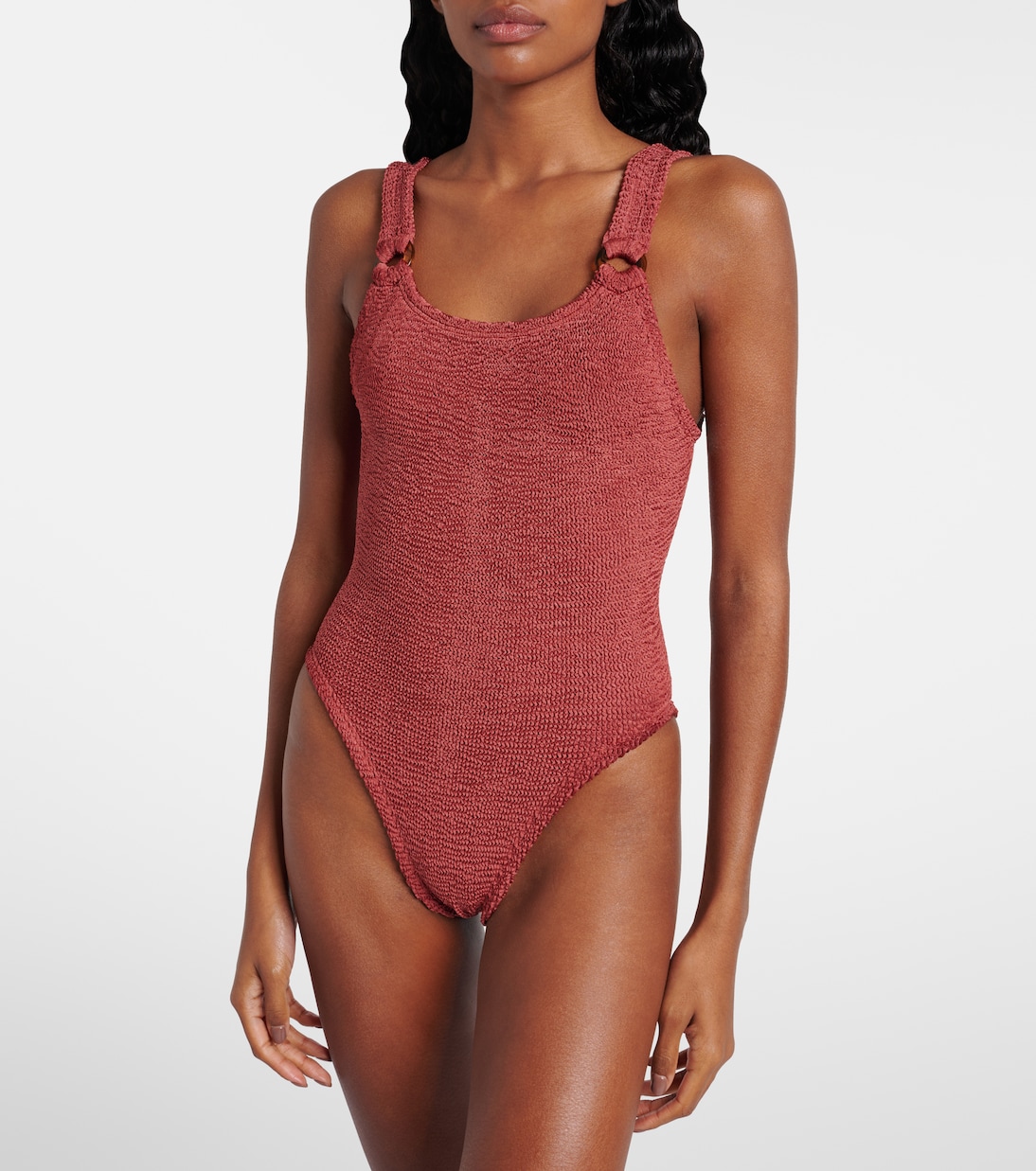 Купальник Domino, фаворит бренда, отличается классическим силуэтом с глубоким вырезом на спине и глубоким овальным вырезом. Этот купальник изготовлен по технологии Seamless Crinkle от Hunza G, что делает его универсальным.