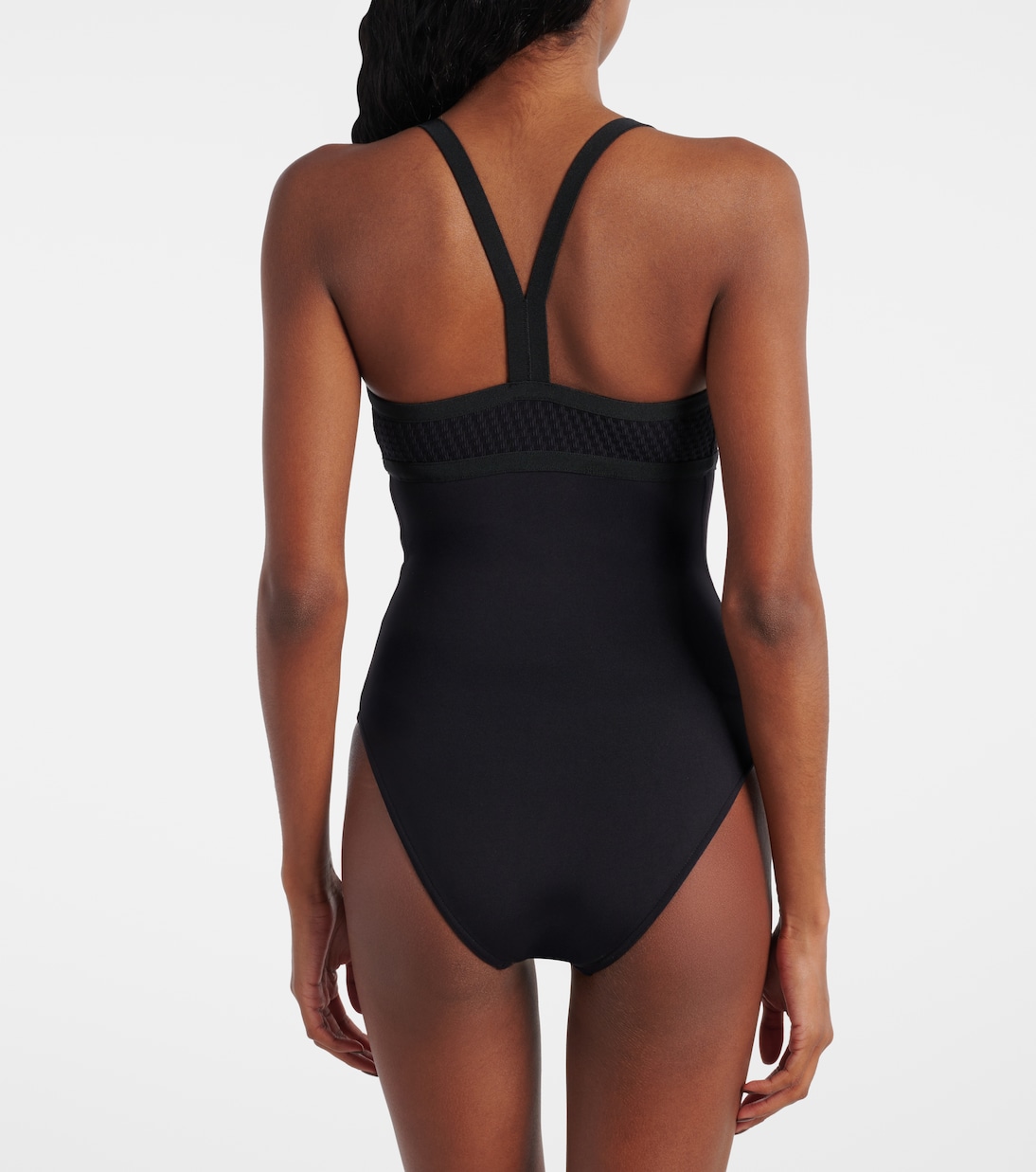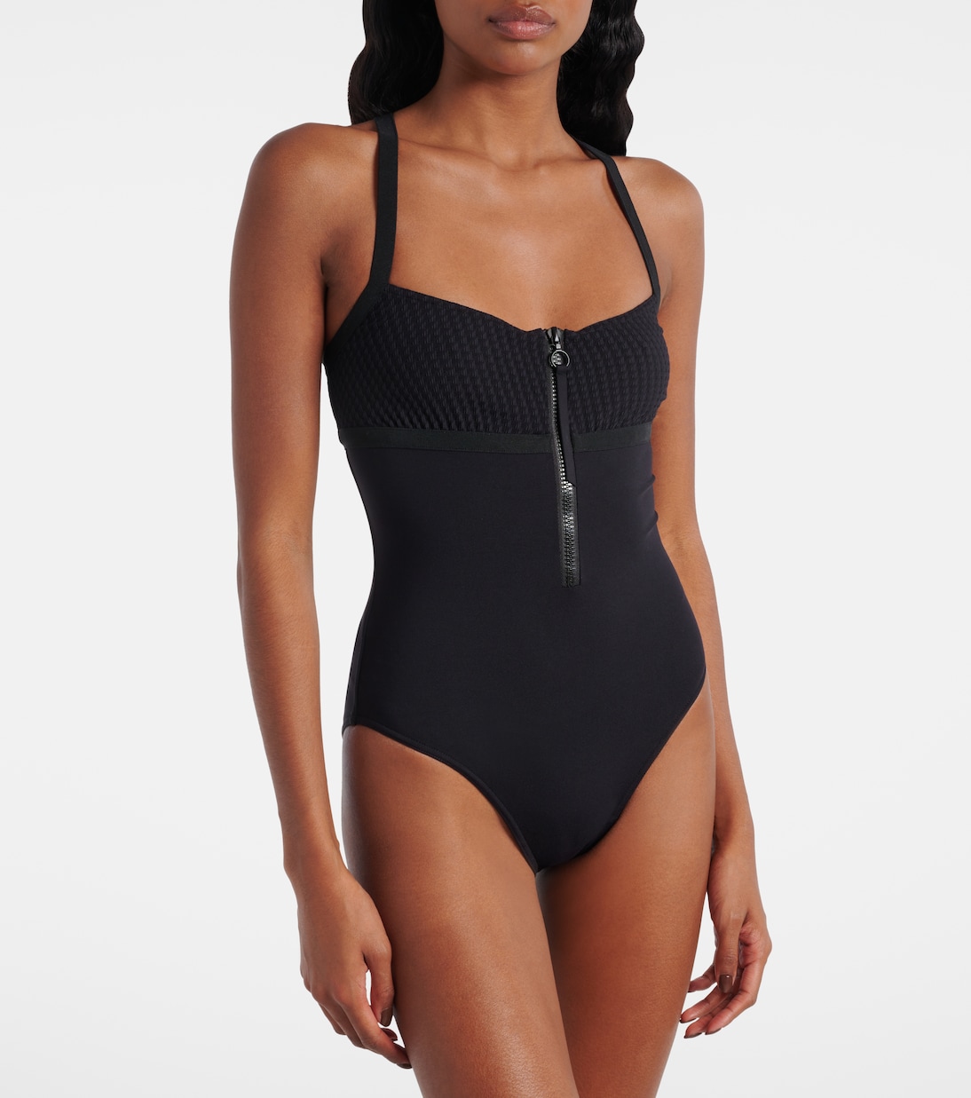 Купальник Egeria от Eres отличается элегантным, скульптурным силуэтом с жаккардовым узором на груди. Бретели-борцовки из репсовой ленты и застежка на молнии создают спортивный ретро-образ.