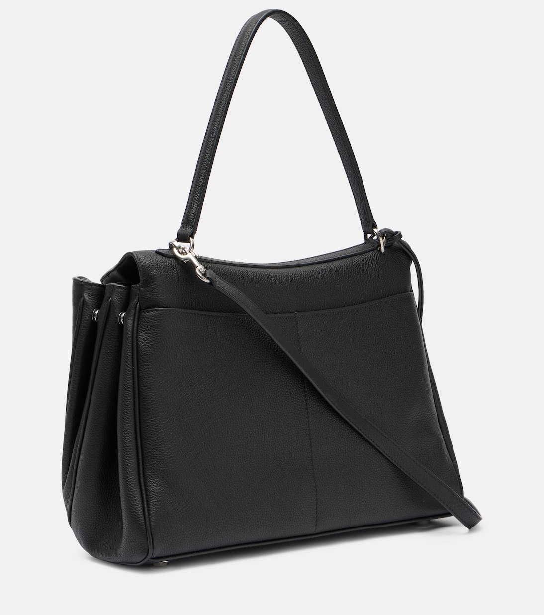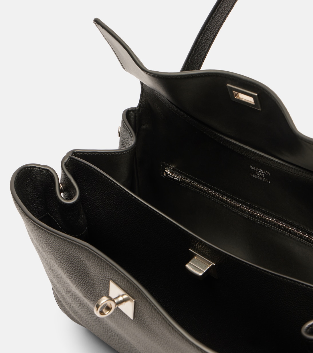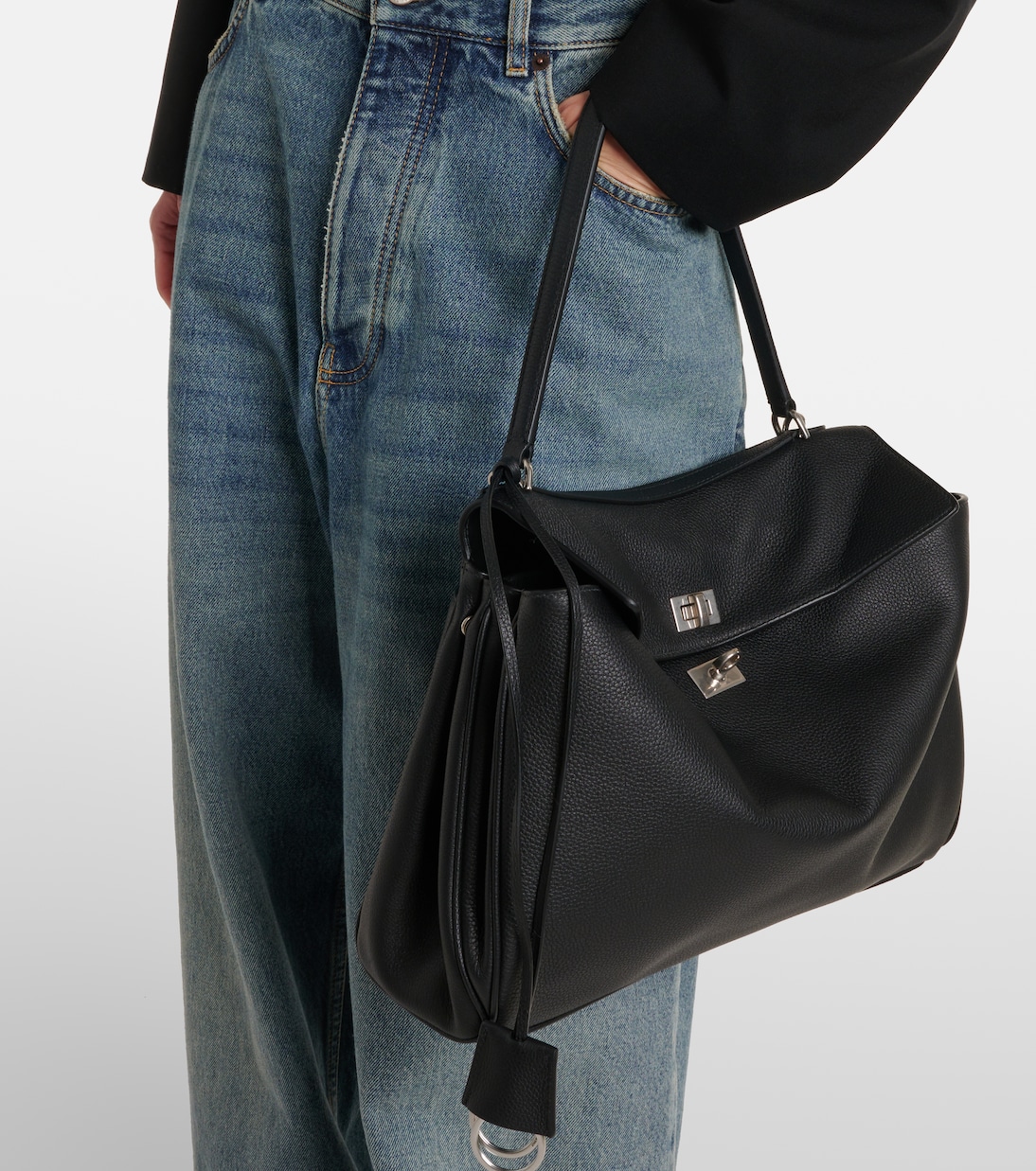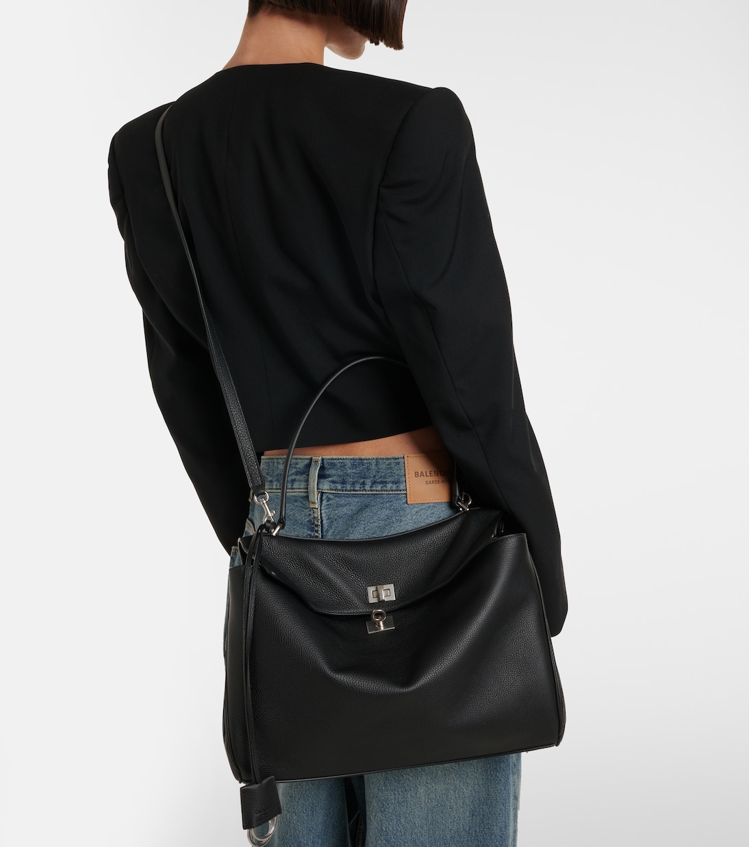 Balenciaga, возникшая в самом сердце Парижа, стала одним из самых влиятельных модных брендов в мире. Сумка через плечо Rodeo, изготовленная в Италии из черной кожи, представлена в размере Medium с серебристой фурнитурой.