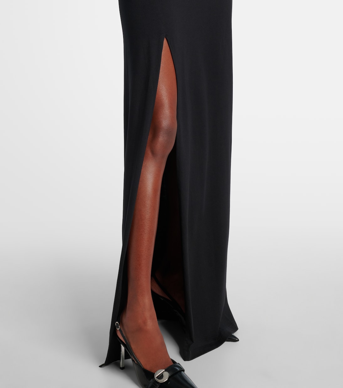 Coperni назван в честь астронома Николая Коперника, чьи точные работы вдохновляют бренд на создание продуманных до мелочей моделей. Это макси-платье из хлопкового джерси с глубоким разрезом спереди и вставкой в форме свитшота по всему силуэту, создающей эффект узелкового плетения.