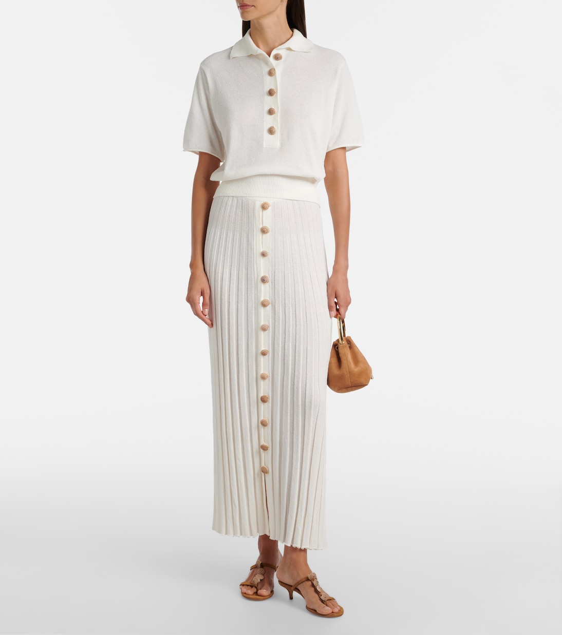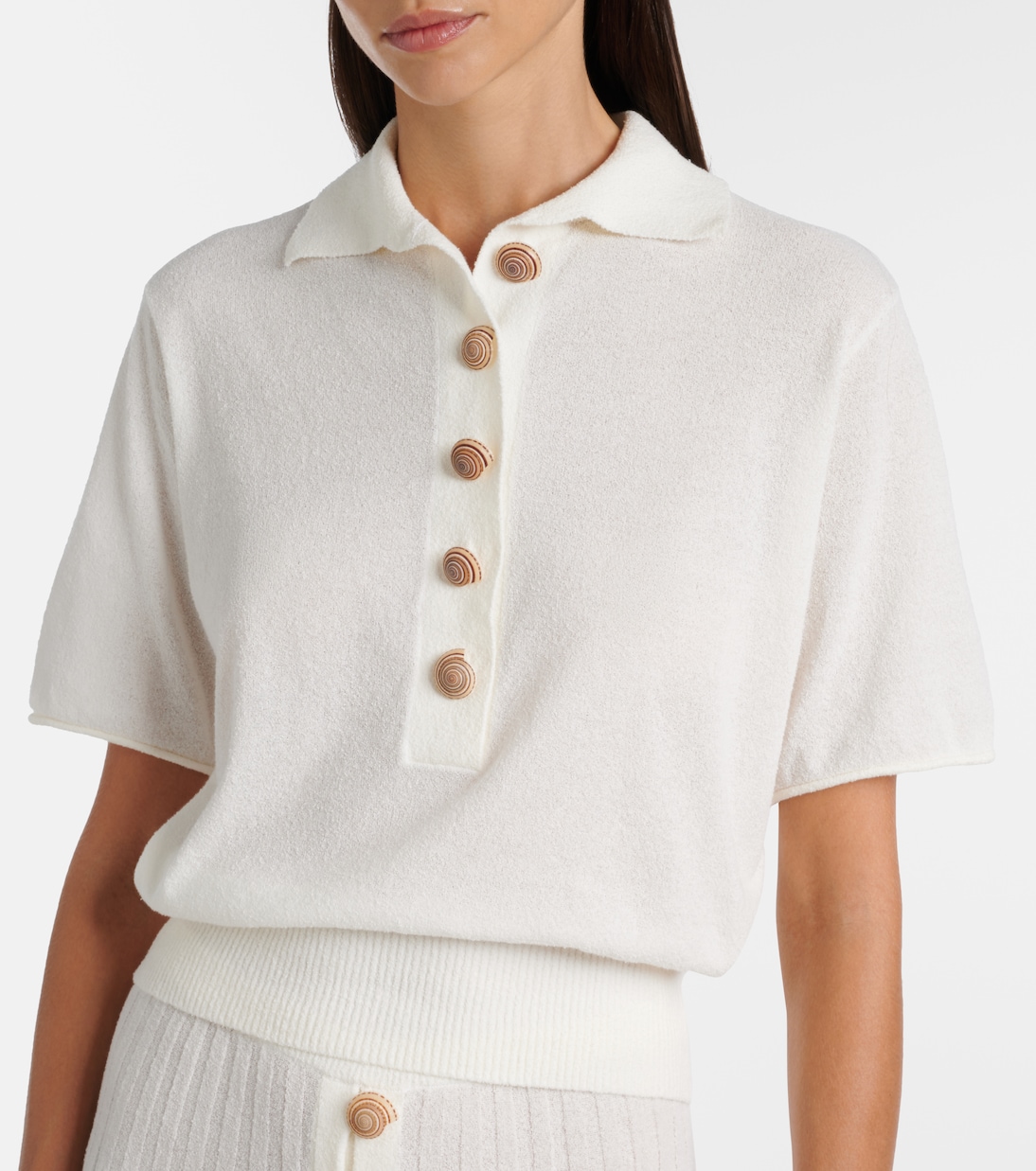 Чувственный крой Кристофера Эсбера воплощает современный взгляд на минимализм. Топ Sundial Shell, выполненный из хлопковой смеси, получил свое название благодаря очаровательным пуговицам в форме ракушек. Он отличается классическим воротником и ребристым подолом.