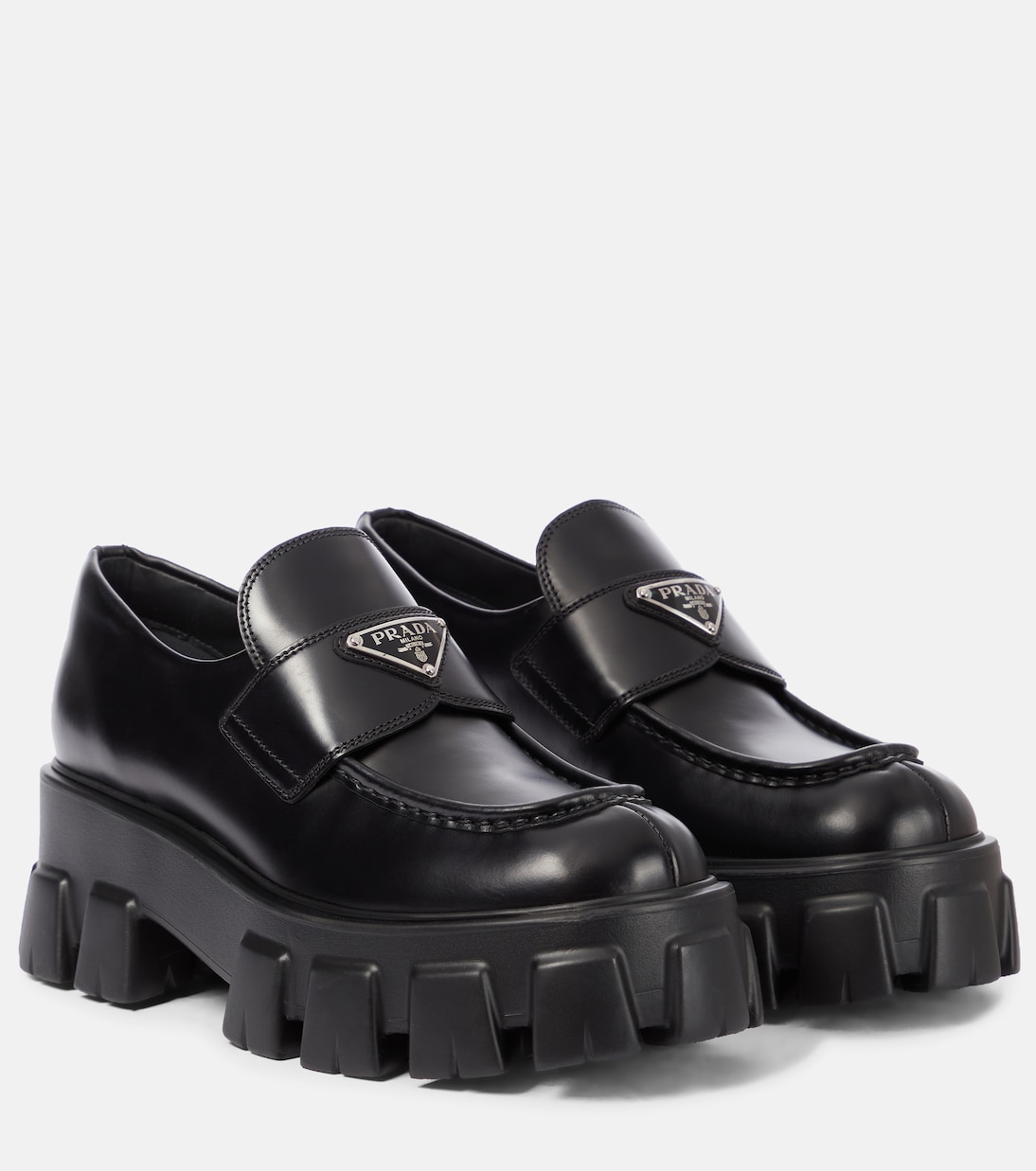 Лоферы Prada Monolith с рифленой подошвой изготовлены из фирменной шлифованной кожи классического чёрного цвета и подойдут ко всему. Они имеют квадратный носок с рельефной строчкой и эмалированные треугольные логотипы на ремешках. И самое главное, они — изящный способ добавить роста вашему образу — они дополнены каблуком-платформой высотой 6 см.