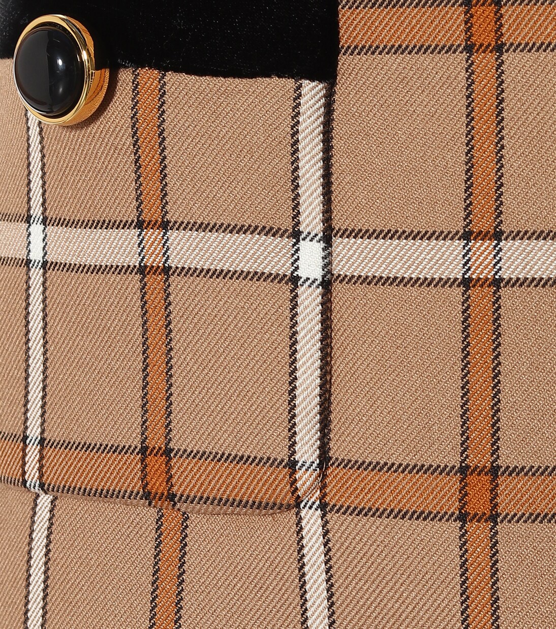 Любимая мини-юбка от Miu Miu сшита в Италии в крупную ретро-клетку. Шикарная модель бежевого цвета «Cammello» дополнена двумя накладными карманами с золотистыми пуговицами спереди. Кружевной топ и туфли «Мэри Джейн» завершат фирменный образ.
