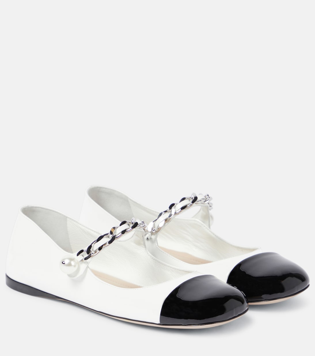Элегантная черно-белая пара Miu Miu сочетает балетки с элементами дизайна Мэри Джейн. Туфли изготовлены из телячьей кожи с глянцевыми лакированными носками, серебристыми цепочками на ремешках и невысоким каблуком для комфорта в течение всего дня.