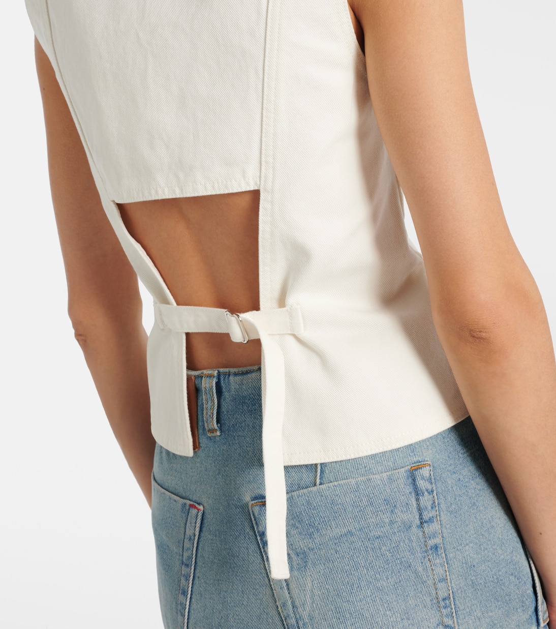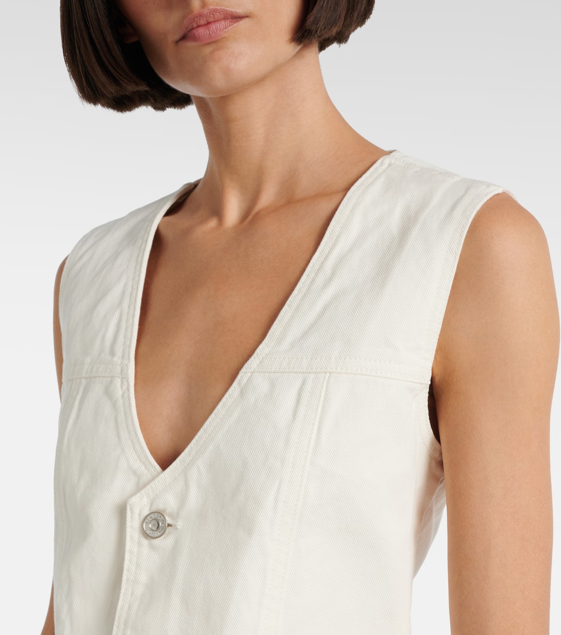 Эмендованный бренд Виктории Бекхэм специализируется на элегантных, сдержанных моделях, создавая универсальный гардероб. Этот жилет из белого денима слегка укороченной длины с присборенной талией создаёт изящный и утончённый силуэт.