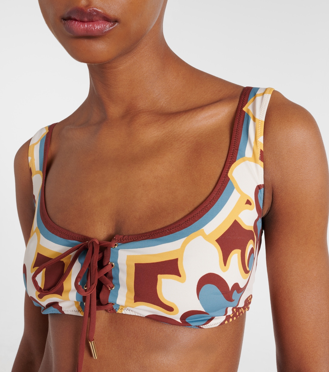 La DoubleJ сотрудничает с ведущими миланскими производителями текстиля, воплощая архивные узоры в своих фирменных эклектичных моделях. Верх бикини Sunset с цветочным принтом дополнен завязкой спереди.