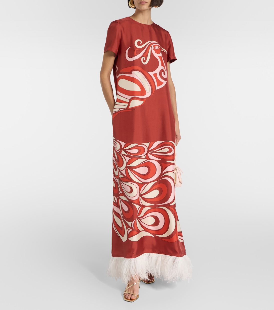 La DoubleJ сотрудничает с ведущими миланскими производителями текстиля, воплощая архивные узоры в своих фирменных эклектичных моделях. Длинное платье Swing выполнено из шёлка с отделкой из перьев по подолу.