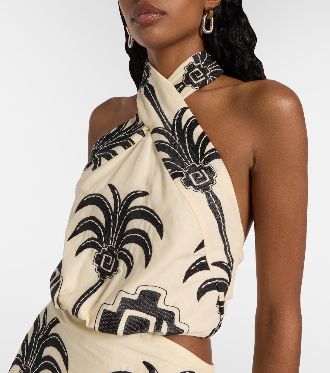 Мини-платье Pintaderas от Johanna Ortiz, выполненное из хлопковой смеси, с вышитым узором и завязкой на шее, украшено принтом тропических пальм по всей поверхности и завязывается сзади.