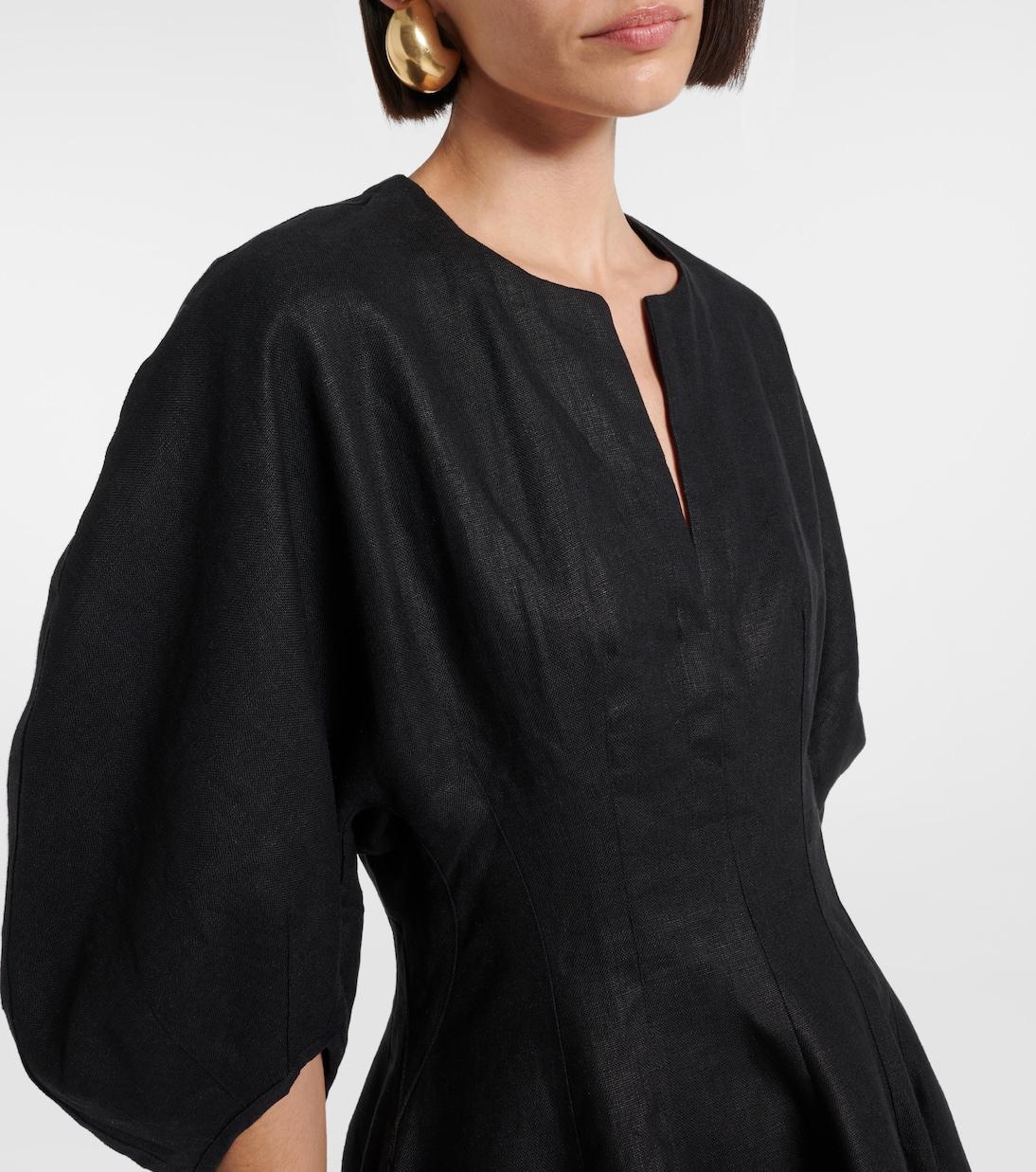 Мини-платье Soleil от Faithfull – дань уважения бренду к путешествиям и лету. Воздушный, скульптурный силуэт, эта модель выполнена из льна с рукавами-фонариками и узким разрезом на горловине.