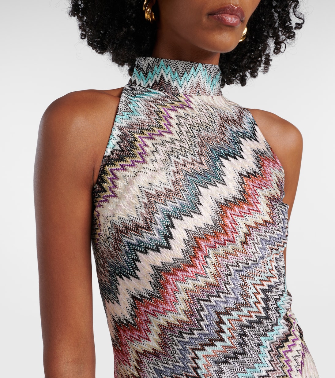Missoni дополняет свои культовые полоски мерцающими пайетками, сочетая мастерство и гламур в каждом изделии. Это мини-платье из ламе с американской проймой, а зигзагообразный узор — фирменный штрих.