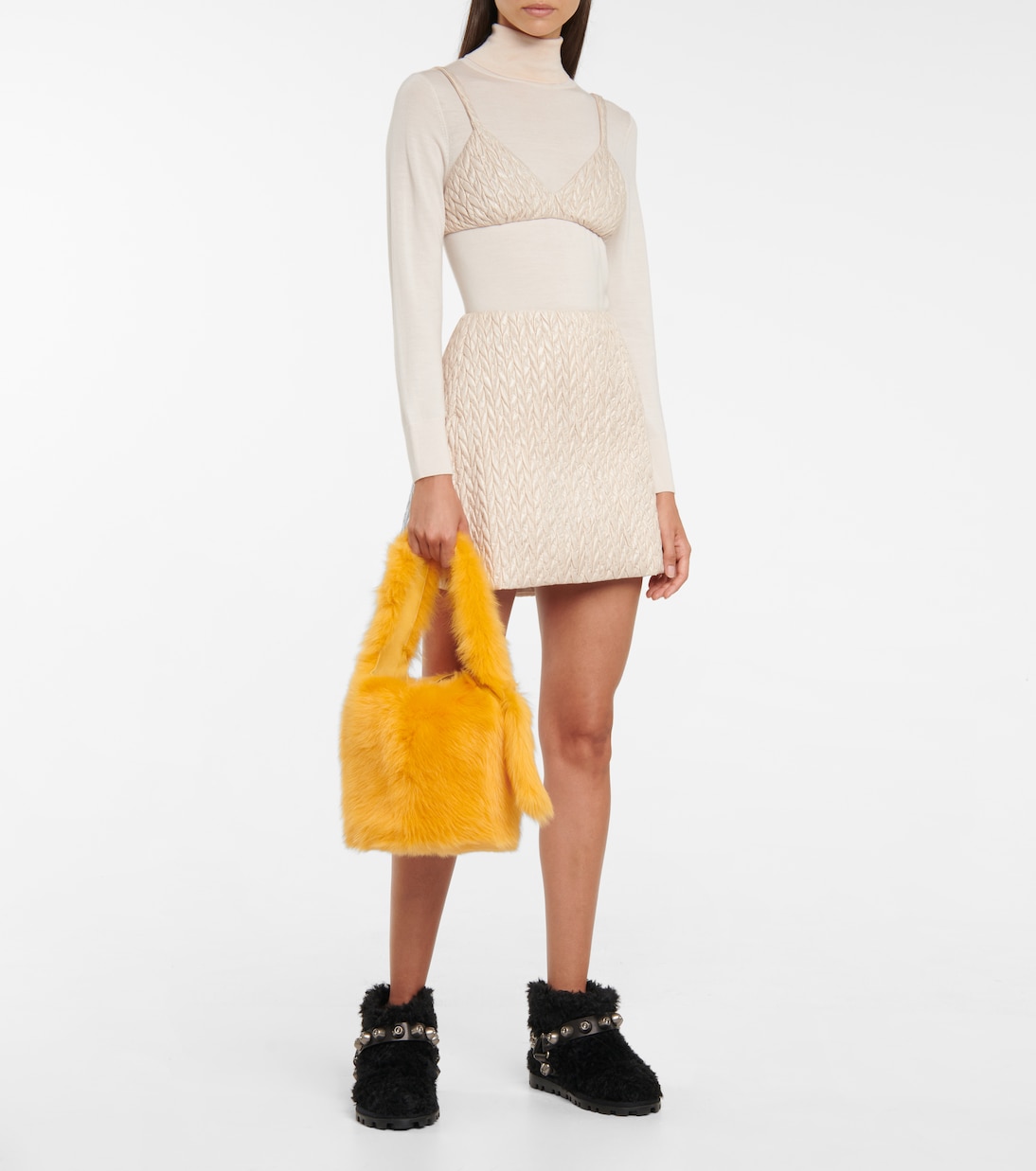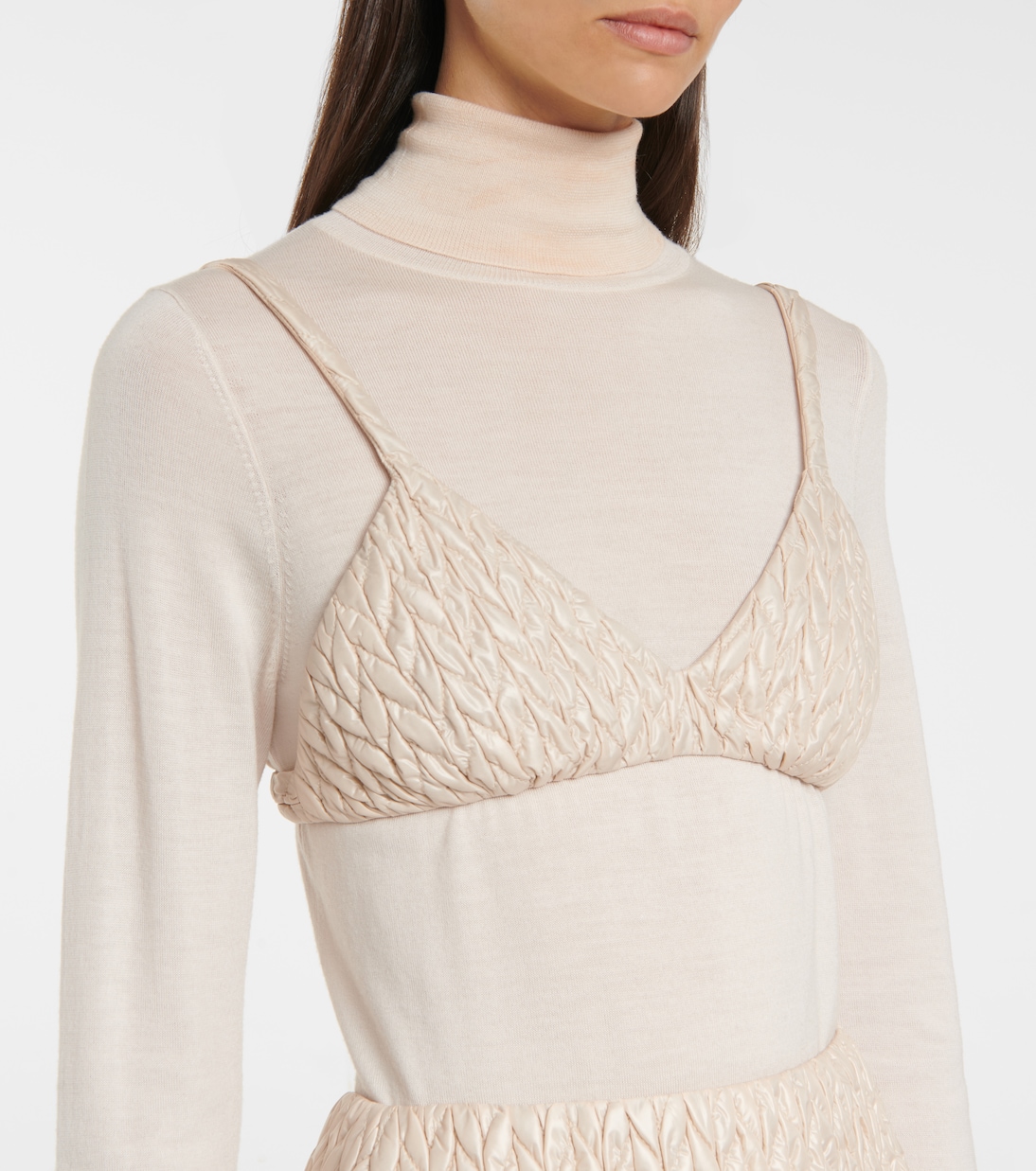 Miu Miu добавит гламурности вашему базовому образу с этим глянцевым бежевым бюстгальтером-бралеттом. Стеганый дизайн выполнен из нейлона в форме треугольника с мягкими чашечками.