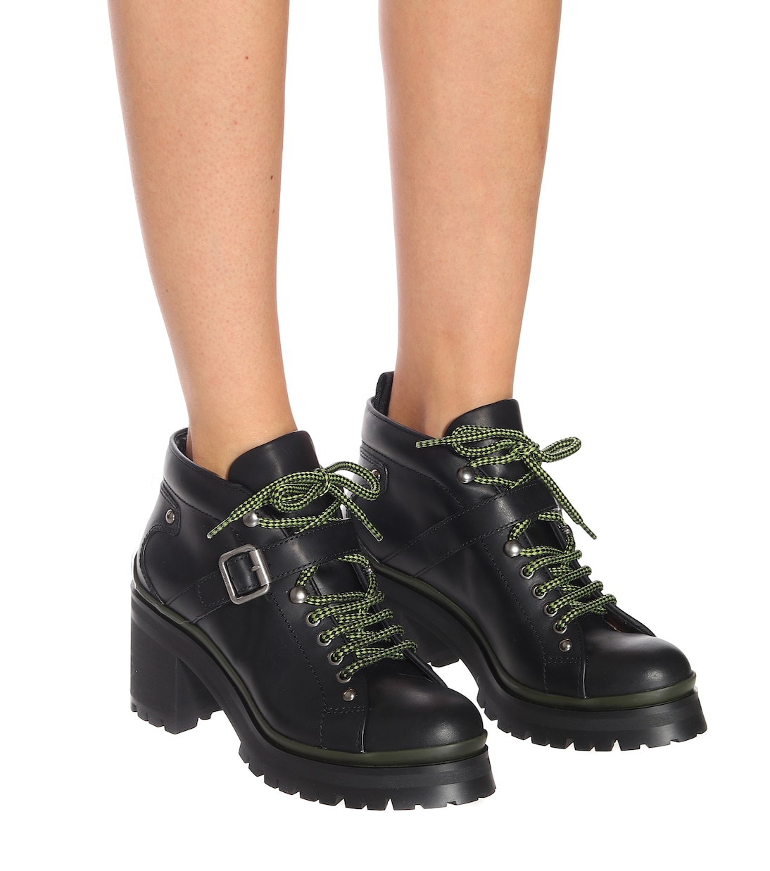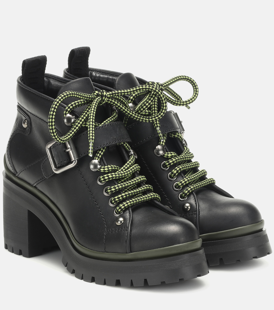 Miu Miu добавляет этим кожаным походным ботинкам на массивной блочной подошве стильный и одновременно женственный штрих. Они изготовлены в Италии, с зелёно-чёрными шнурками, ремешком с пряжкой по всему верху и удобным язычком сзади.