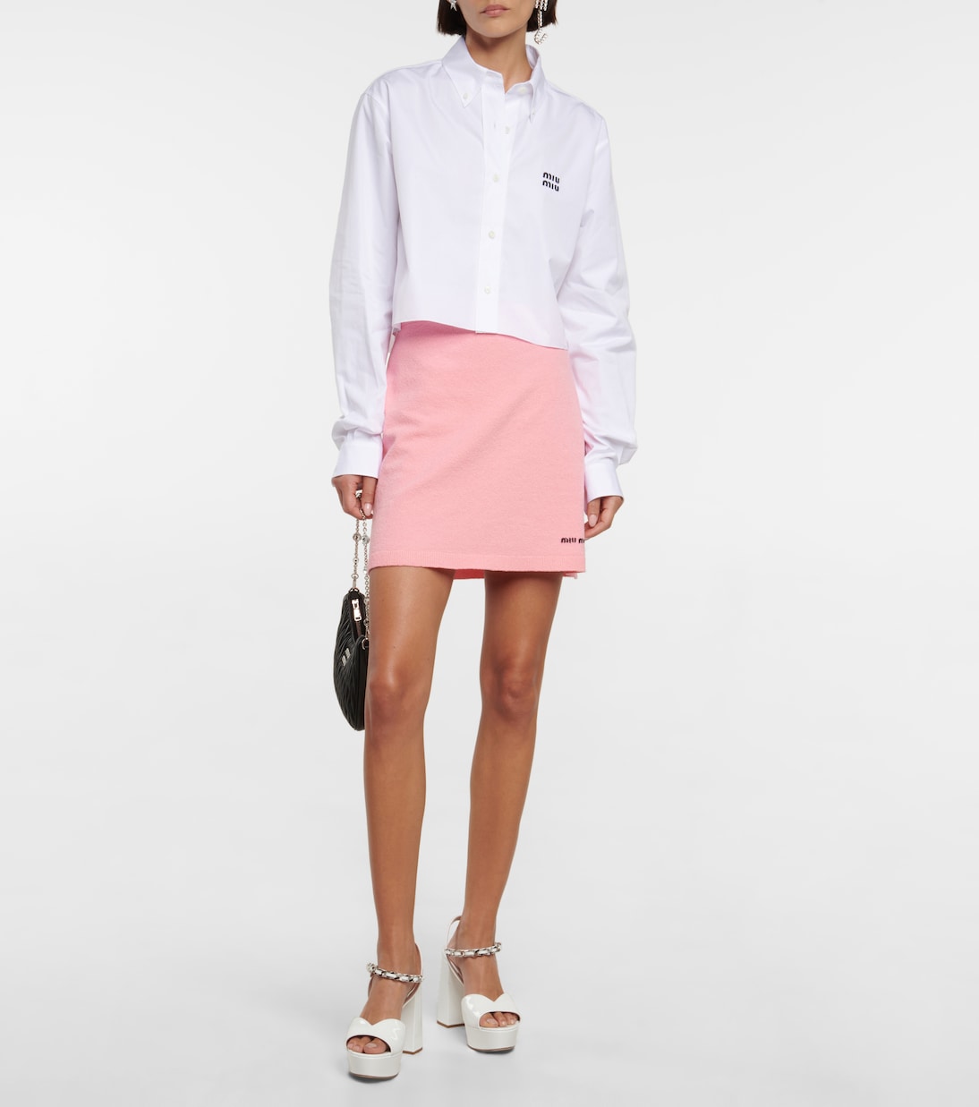 Miu Miu переносит обувь в духе 70-х, представляя эти туфли на платформе. Они изготовлены из белой лакированной кожи с ремешком на пятке и ремешком на щиколотке с отделкой в виде цепочек для оптимальной поддержки.