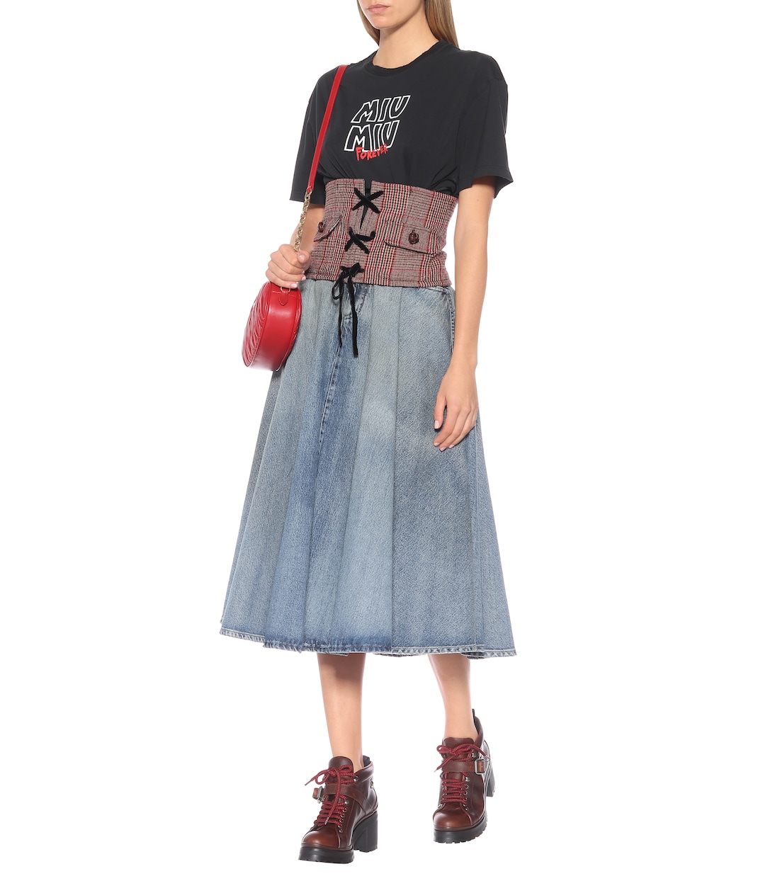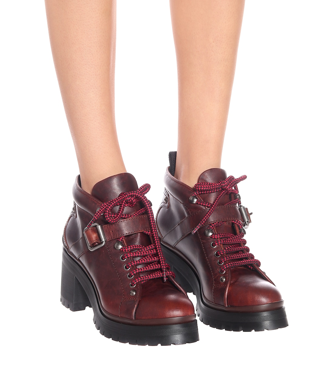 Miu Miu поднимает на новый уровень силуэт походных ботинок, представляя эти кожаные ботильоны цвета «коньяк» коричневого цвета. Сделано в Италии. Они стоят на массивной блочной подошве и дополнены красной шнуровкой и серебристыми металлическими деталями.