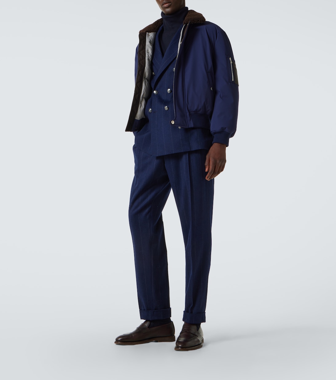 Модели Brunello Cucinelli создаются в Соломео, средневековой деревушке, где искусство и традиции вплетены в каждую нить дома. Эта куртка-бомбер с воротником из мягкой овчины, кожаными вставками и множеством карманов.