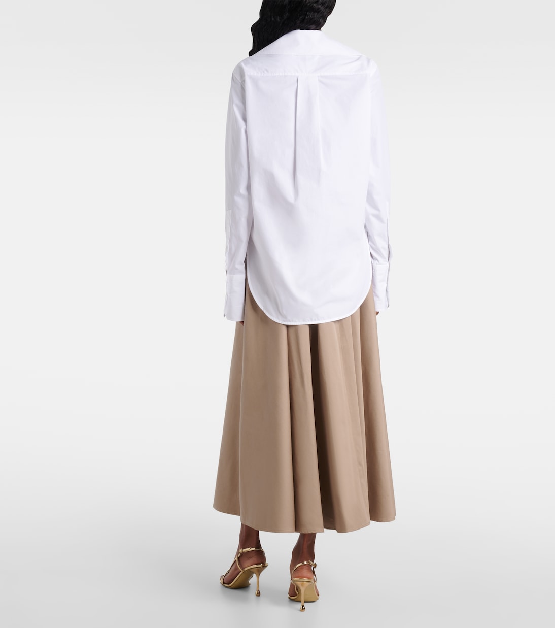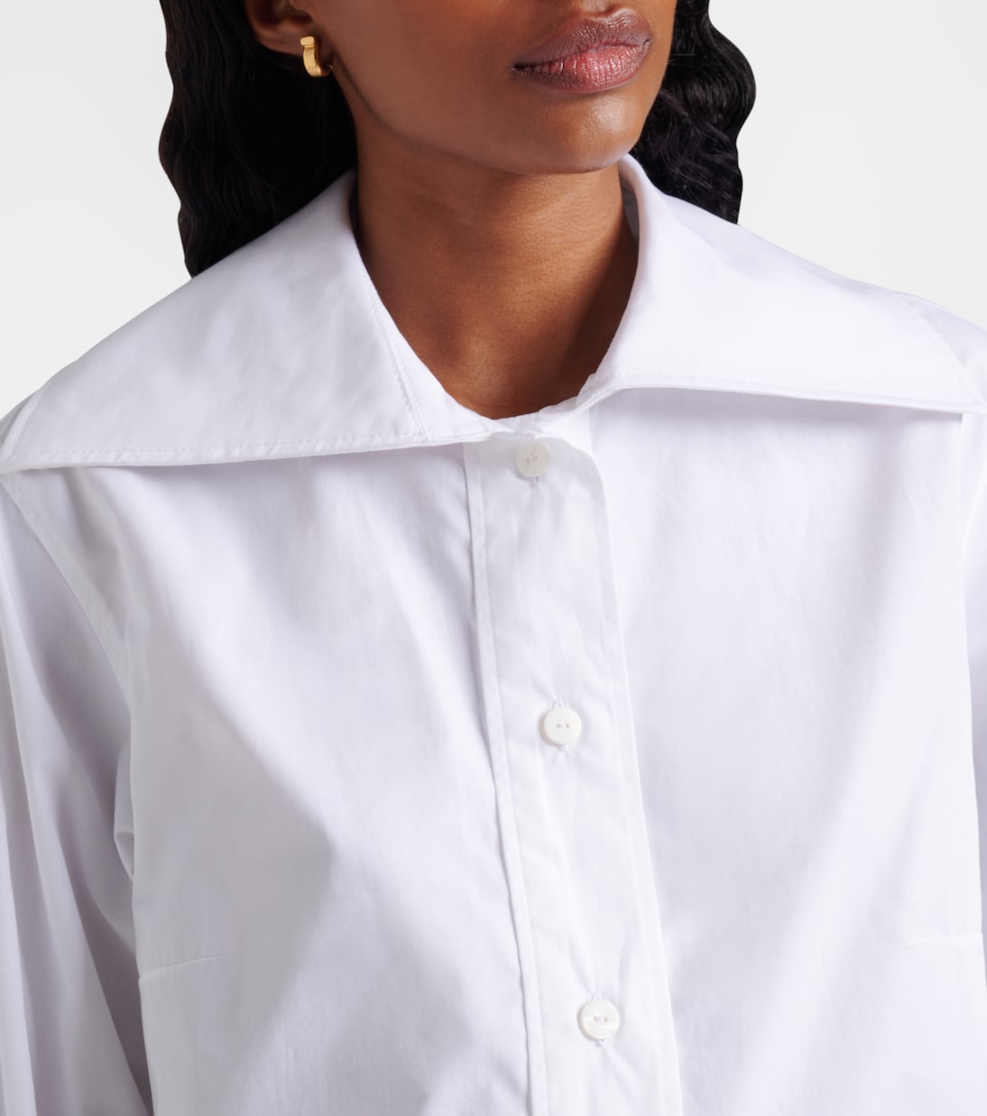 Patou продолжает определять парижский стиль, предлагая жизнерадостные и изысканные модели. Рубашка Violin из хлопкового поплина имеет приталенный силуэт с асимметричным подолом спереди и сзади, дополнена широким острым воротником и застежкой на пуговицы спереди, что придает ей непринужденную изысканность.