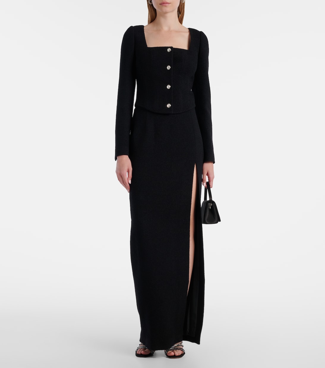 Эта макси-юбка Alessandra Rich демонстрирует изысканный элегантный силуэт с глубоким разрезом сбоку, придающим ей современный вид. Изделие выполнено из букле из шерстяной саржи и отличается высокой линией талии.