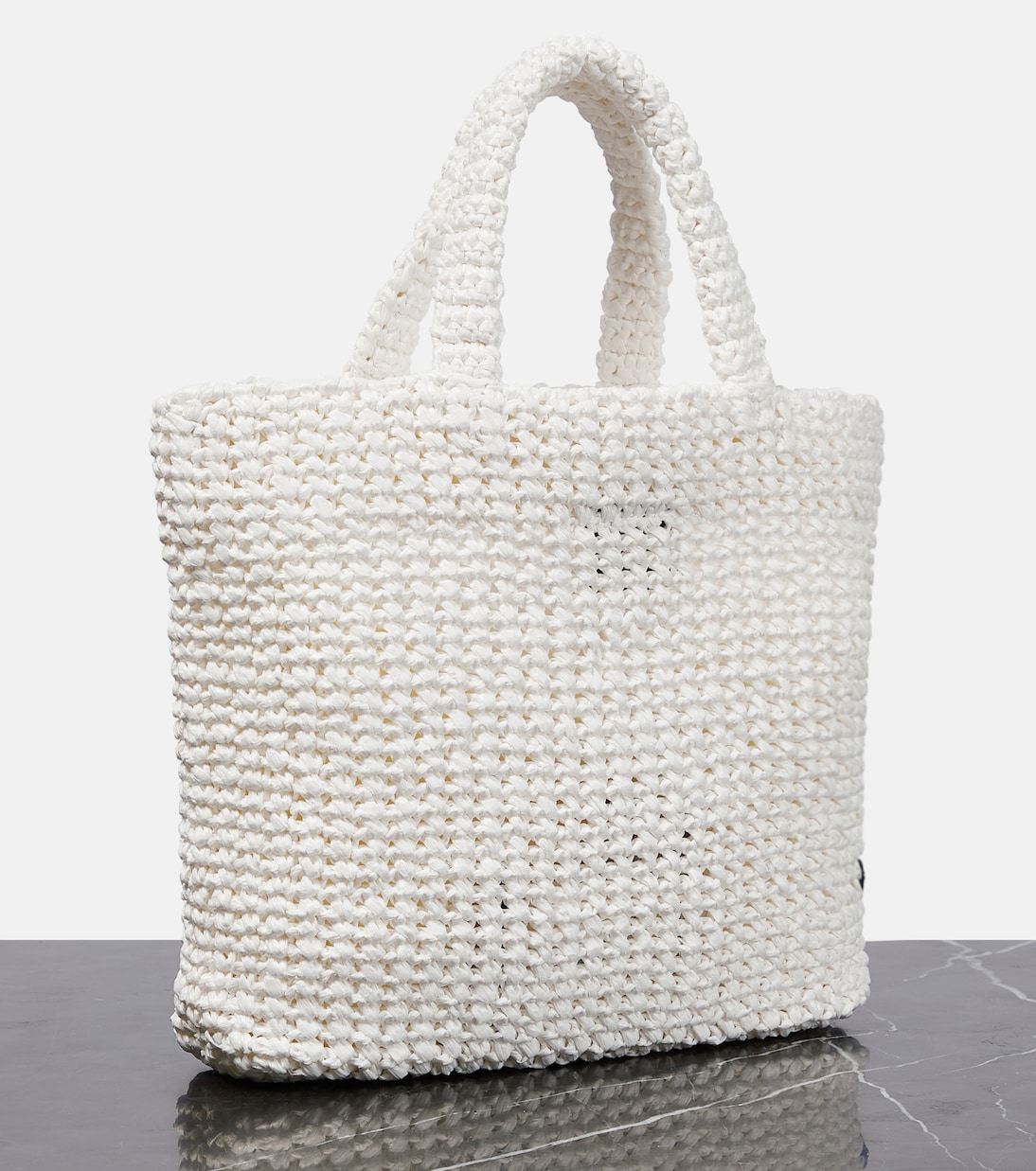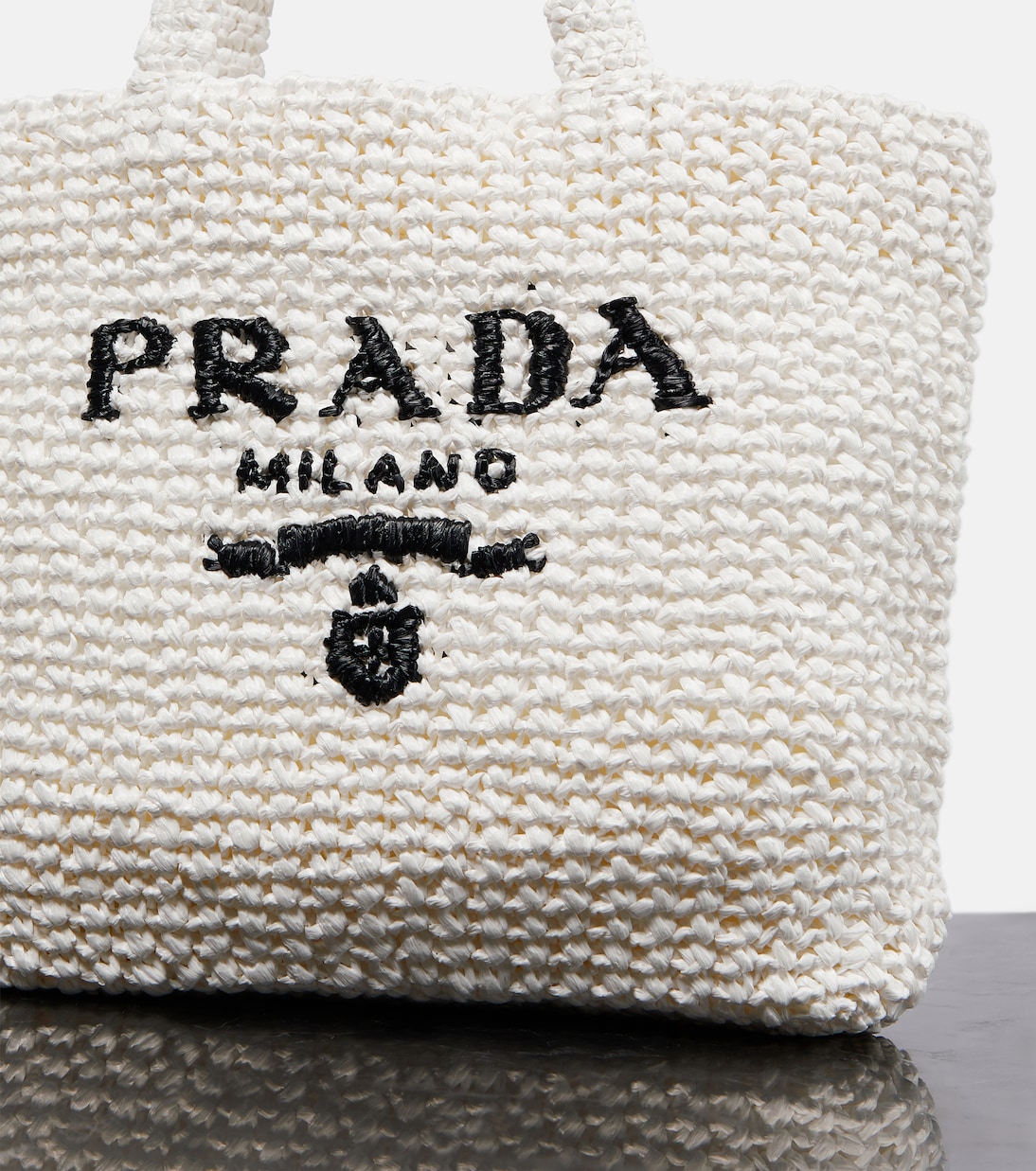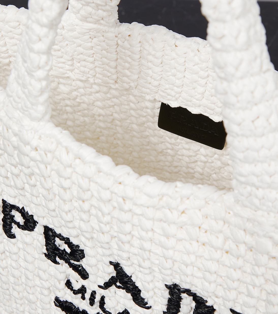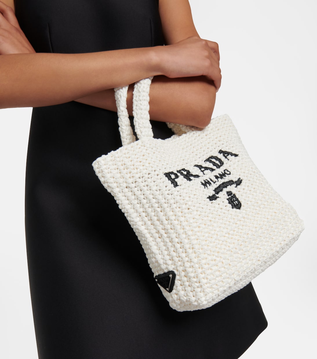 Эта маленькая сумка-тоут от Prada — идеальный спутник для повседневных летних дней. Полностью связанная крючком с эффектом рафии, она имеет мягкие формы и дополнена контрастным логотипом спереди.