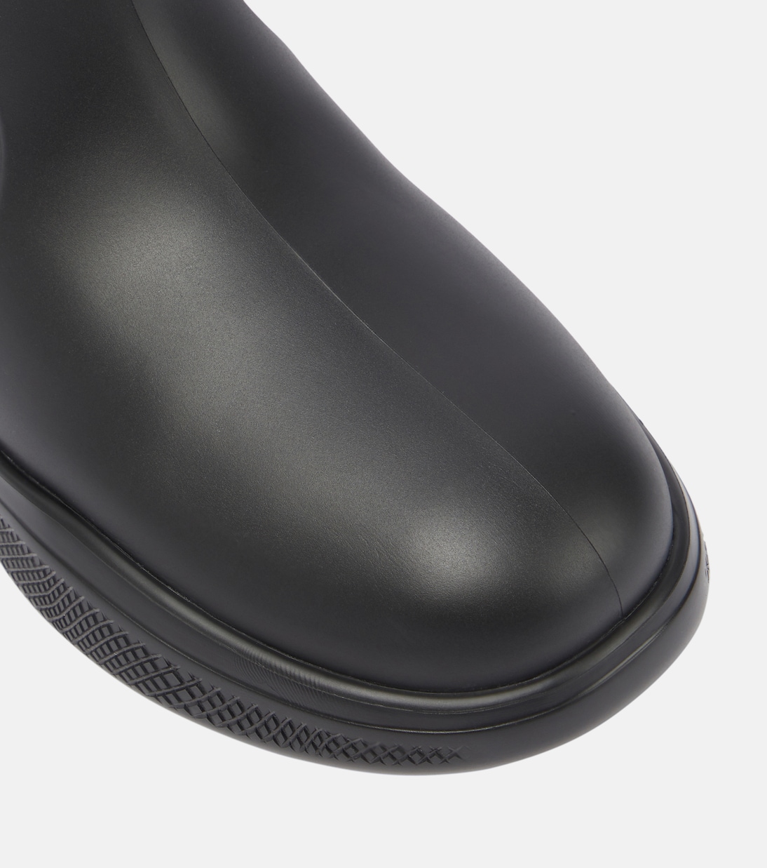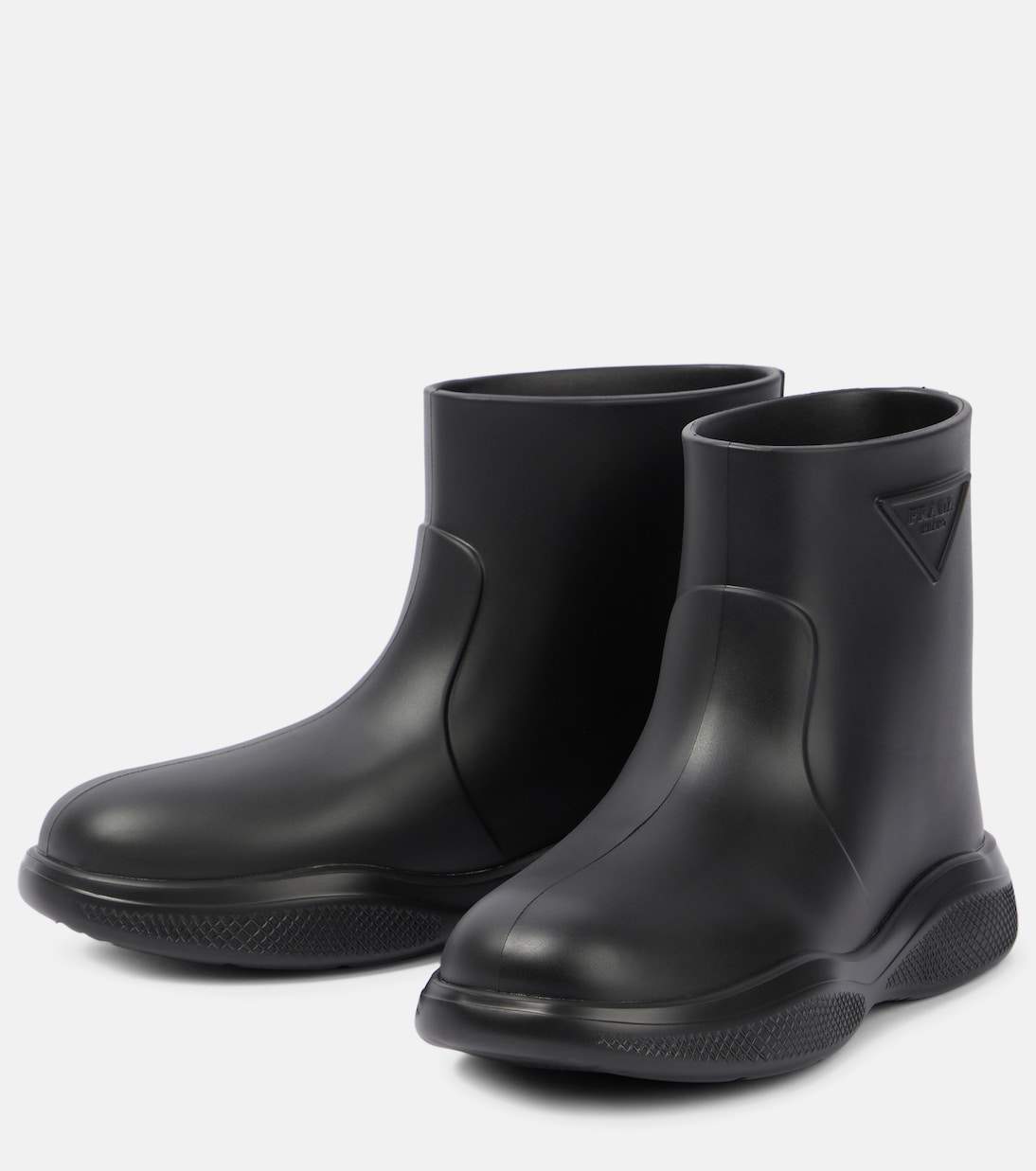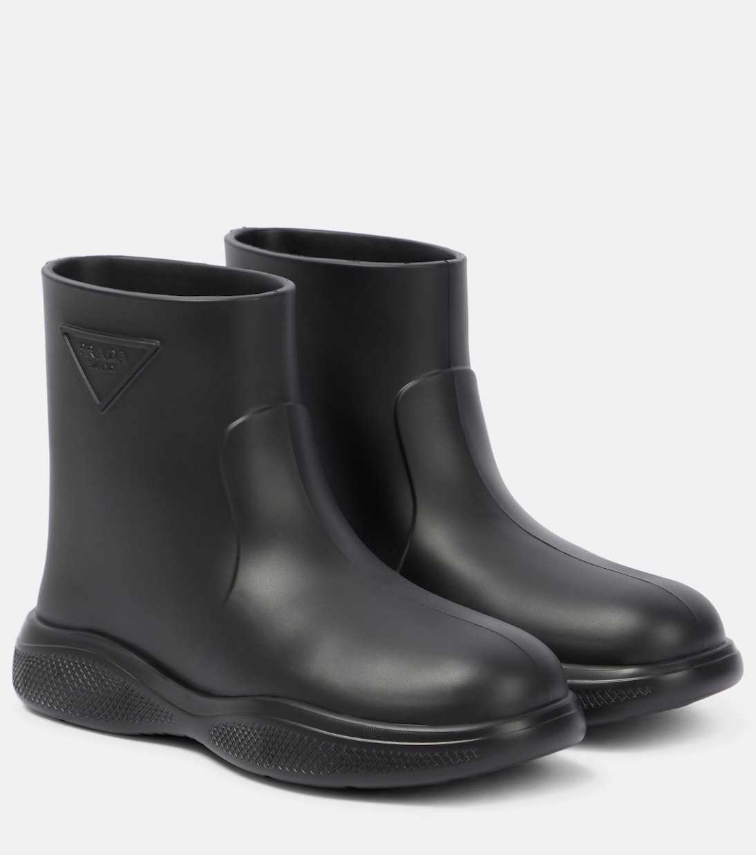 Prada — это всегда классика, вневременная обувь. Ботильоны Mellow полностью изготовлены из чёрной резины, украшены треугольными логотипами по бокам и установлены на фактурную подошву.