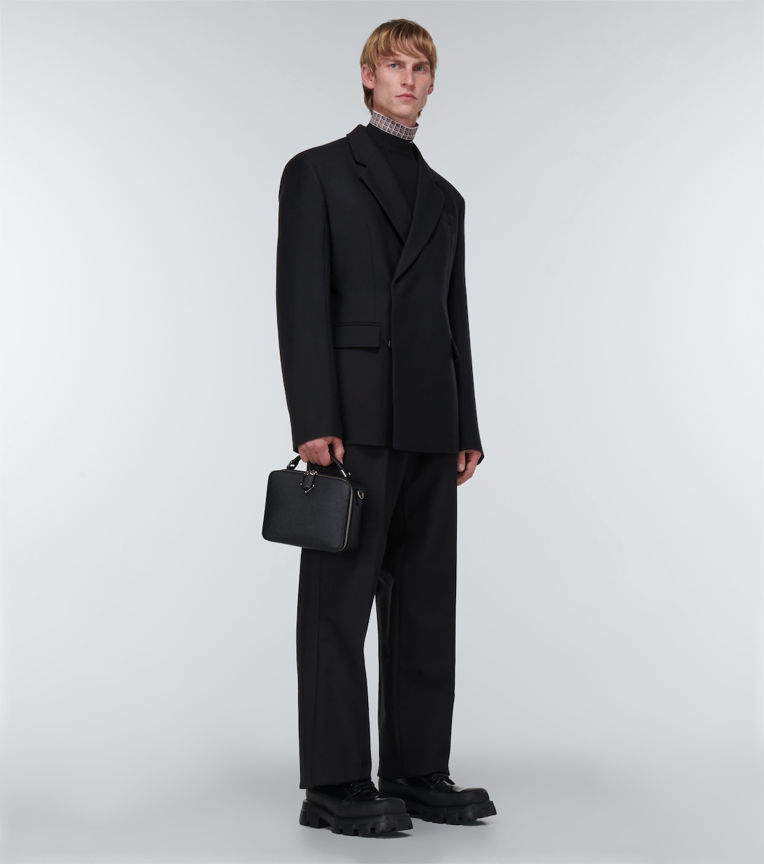 Prada добавляет современный штрих к классическому стилю с этим шерстяным блейзером. Он плотно облегает фигуру, имеет структурированные плечи, вытачки на груди и сочетание карманов с клапанами и прорезных карманов.
