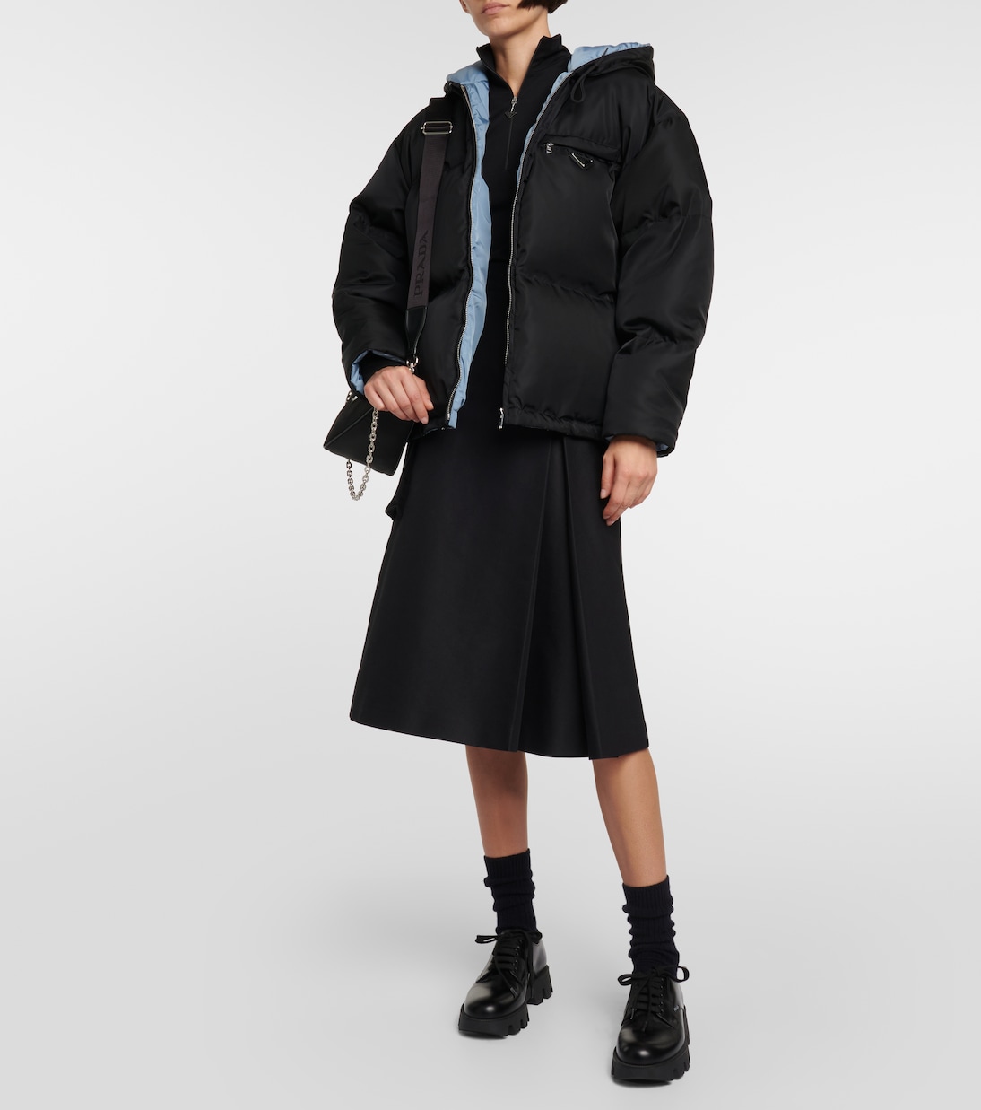 Эта модель украшена культовой треугольной пластиной с логотипом Prada, олицетворяющей простоту, элегантность и качество. Эта водолазка скроена из эластичной ткани, имеет приталенный силуэт и застегивается на молнию до середины груди.