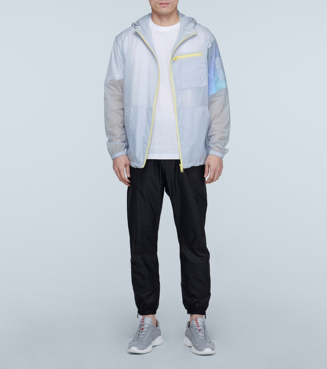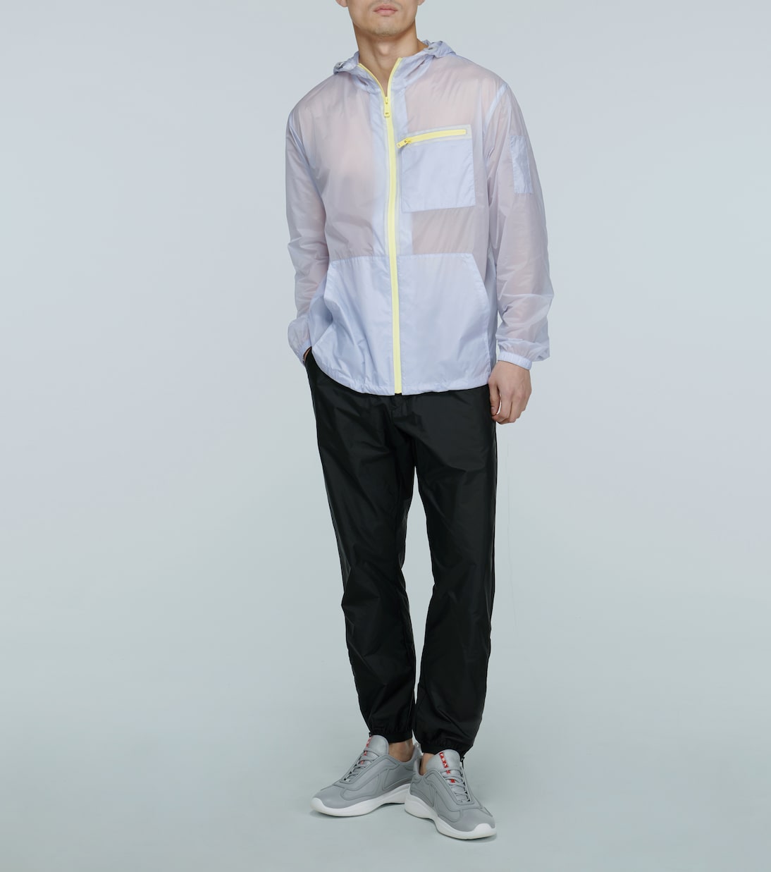Эта полупрозрачная техническая куртка с капюшоном Prada, представленная в эксклюзивной капсульной коллекции Prada x Mytheresa Men, отличается бледно-голубым цветом и контрастными желтыми молниями.