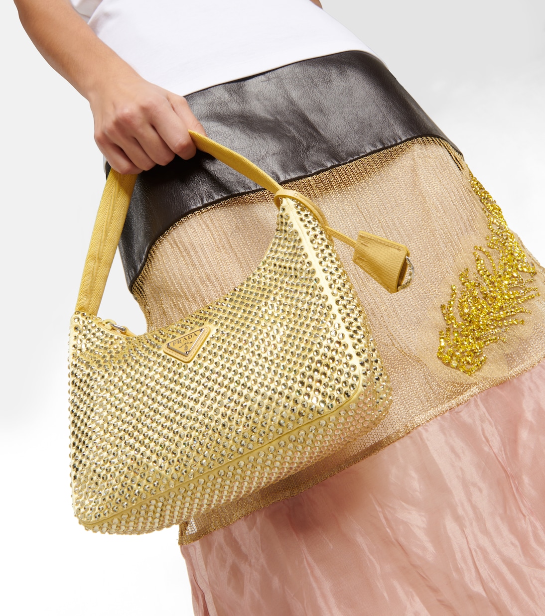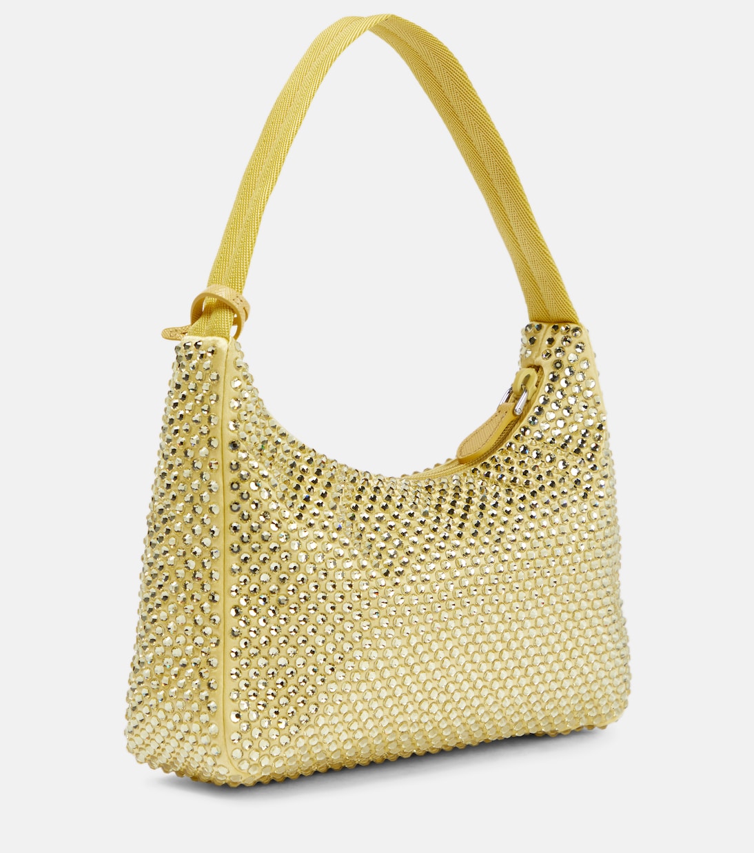 Насладитесь стилем нулевых с этой сумкой через плечо от Prada, которая представляет собой переиздание модели, выпущенной в 2000-х. Она выполнена из атласа и инкрустирована мелкими кристаллами по всей поверхности.